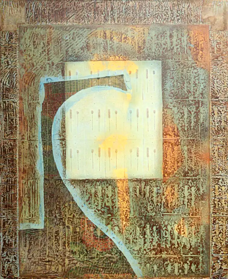 Léon DIAZ RONDA (XXème). Collage abstrait. Technique mixte sur bois, monogrammée en bas à droite, contresignée et monogrammée au dos. 73,5 x 60 cm