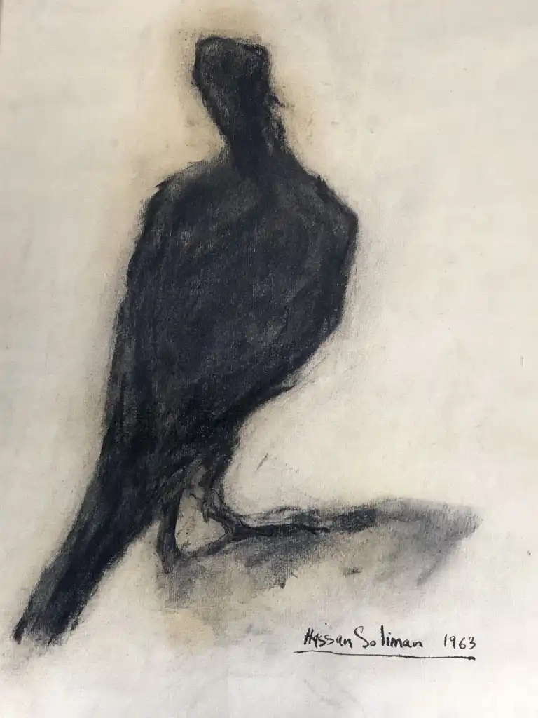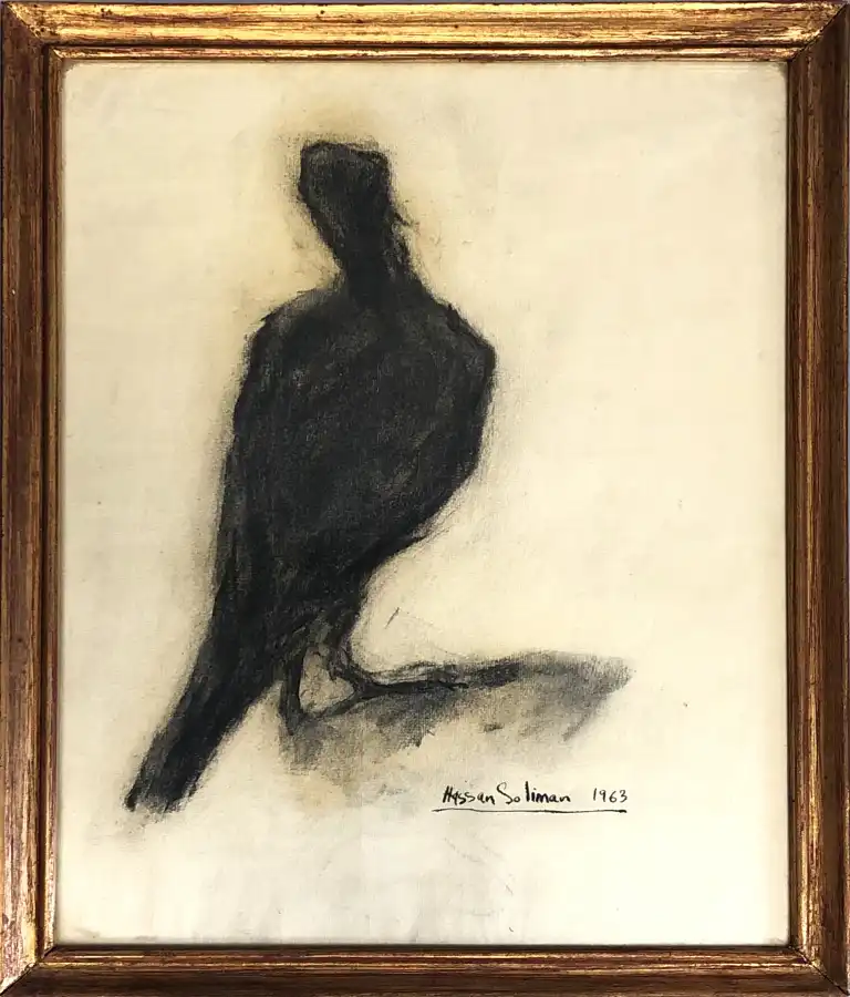 Hassan SOLIMAN (1928-2008). Oiseau dans l'ombre. Dessin au fusain, signé et daté en bas à droite. 39.5 x 30 cm