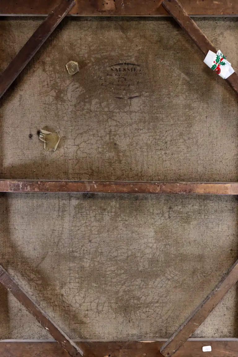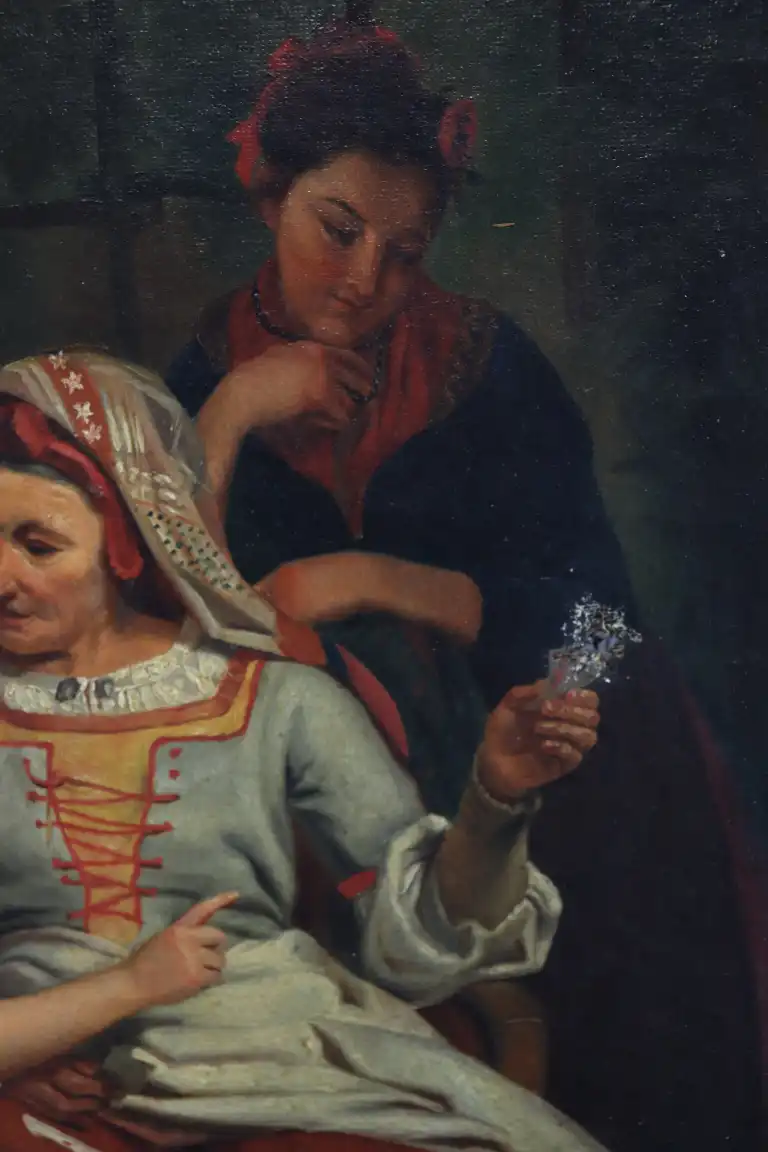Ecole du XIXème siècle. La diseuse de bonne aventure. Huile sur toile. 73 x 60 cm. (Trous, sauts de peinture, trace de colle)