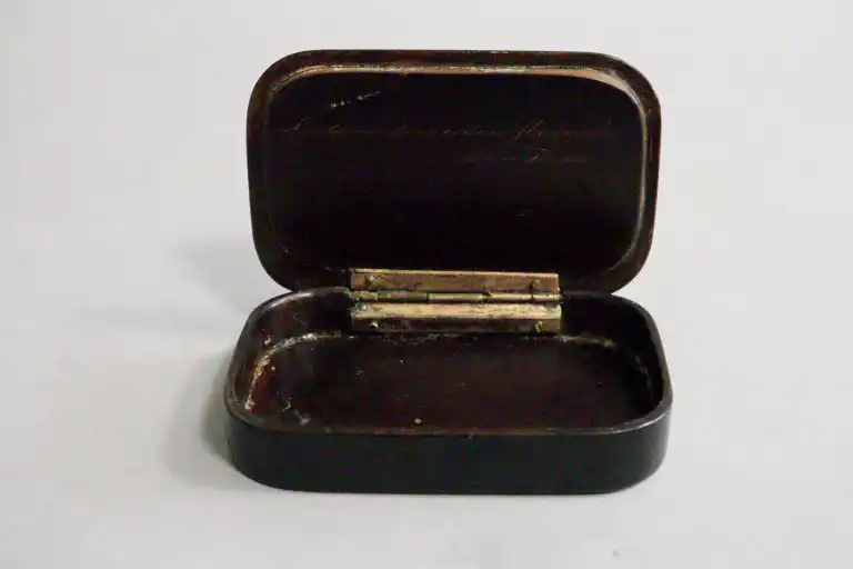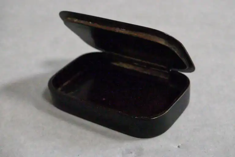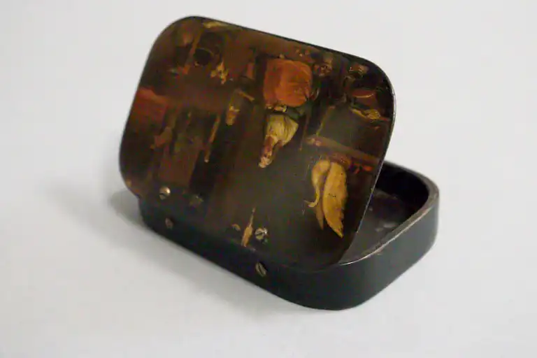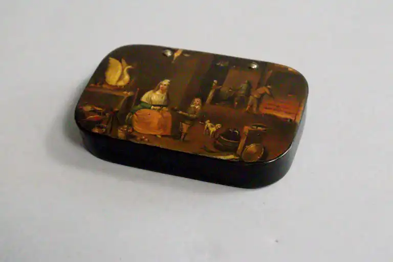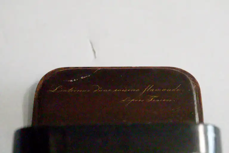 D'après David TENIERS. Intérieur d'une cuisine Flamande. Petite boîte rectangulaire en bois laqué noir, le couvercle à décor peint. Inscription cursive à l'intérieur. Dim. de la boîte : H.: 1.7 cm - L.: 9 cm - P.: 6 cm