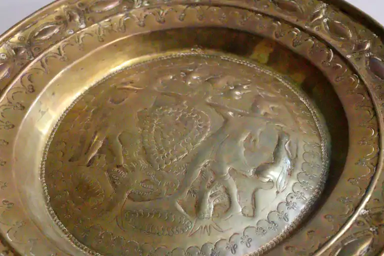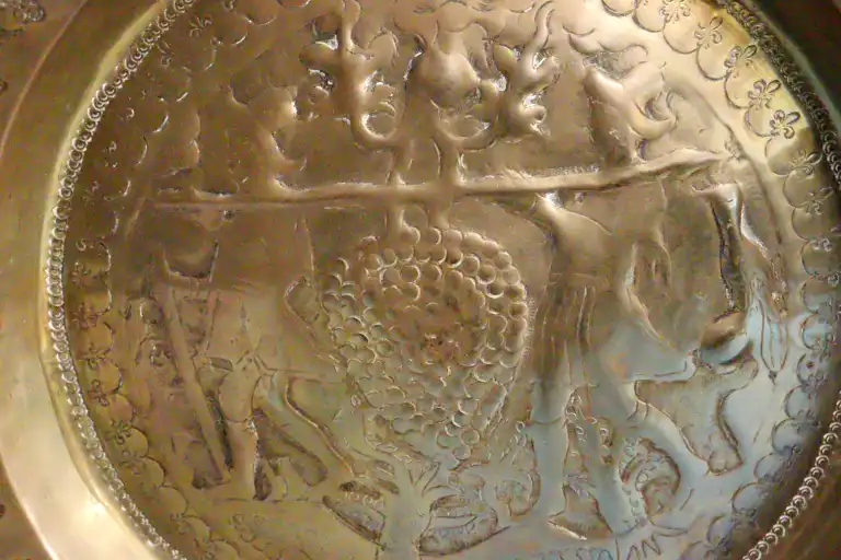 Plat à offrande en laiton doré à décor repoussé d'une allégorie des vendanges ou pressoir mystique, le marli estampé d'une frise géométrique et arcatures stylisées. Nuremberg. XVIIème siècle. D.: 37 cm