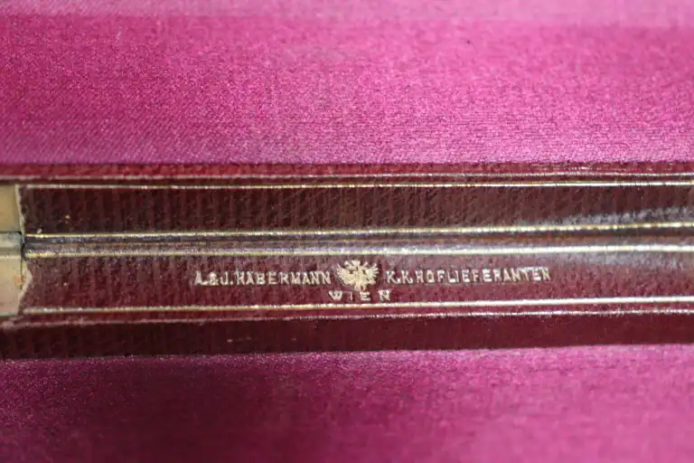 A.&J. HABERMAN K.K., HOFLIEFERANTEN WIEN. Coffret en cuir brun légèrement guilloché et souligné de filets dorés, les angles arrondis et le couvercle légèrement bombé, l'intérieur en velours pourpre. Signé sur le bord intérieur en lettres dorées. Autriche. H.: 18 cm - L.: 28 cm - P.: 21 cm (Légères usures)