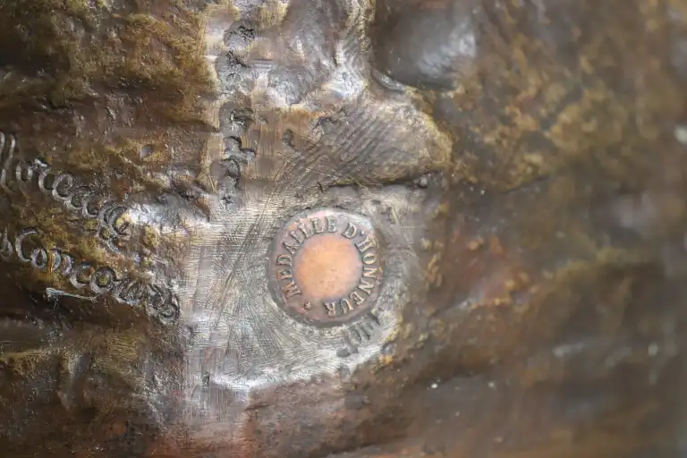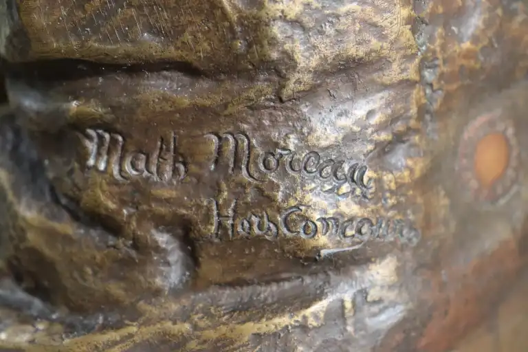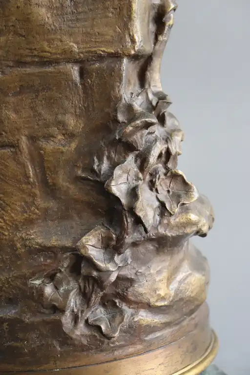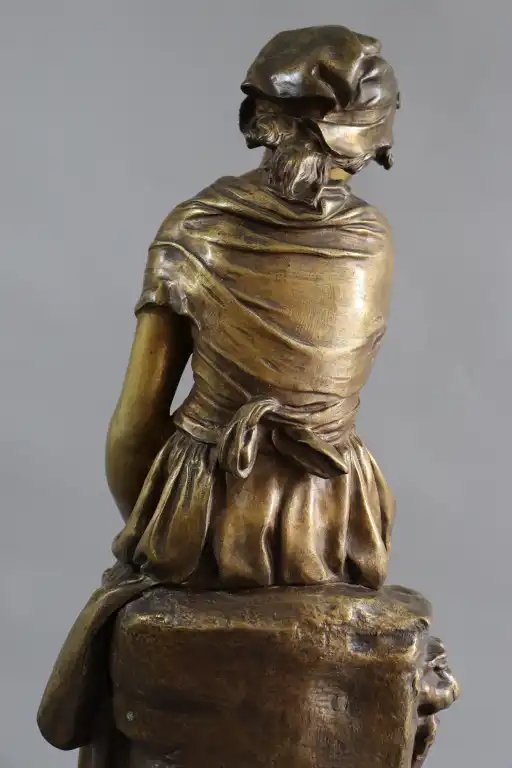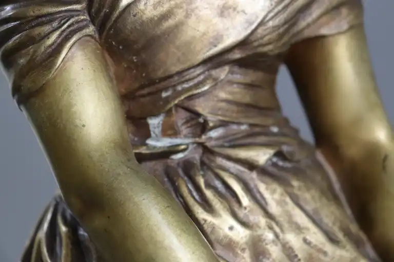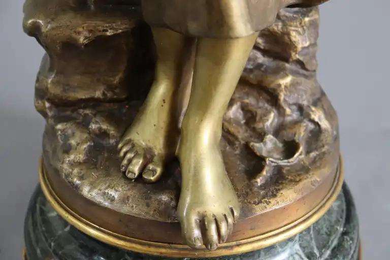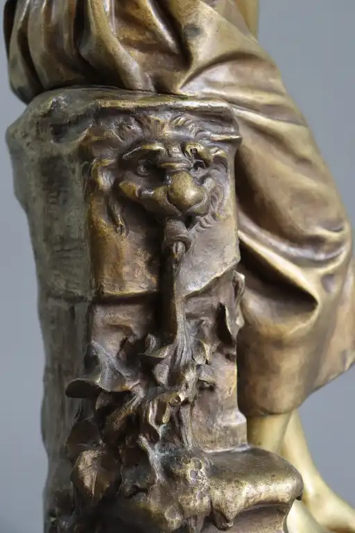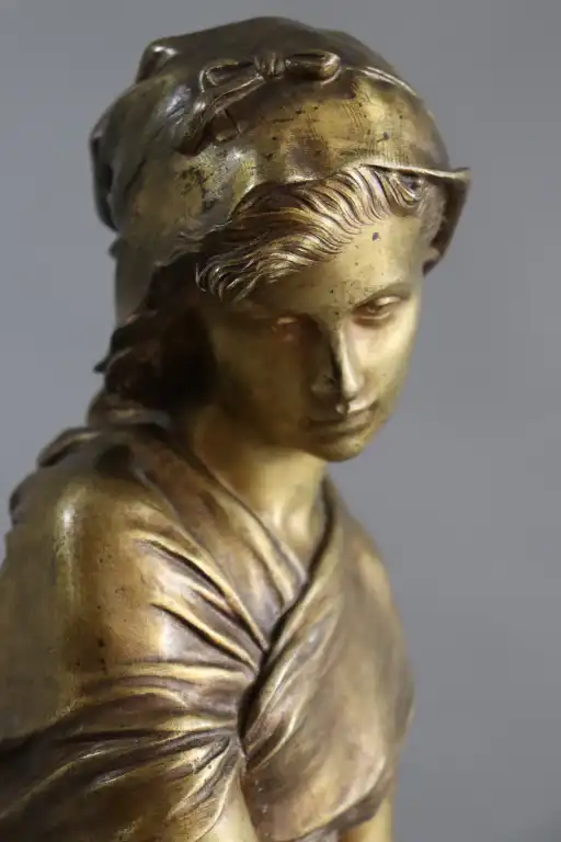 Mathurin MOREAU (1822-1912), d'après. Jeune fille à la cruche. Epreuve en bronze à patine dorée signée en creux, avec la mention hors concours et cachet médaille d’honneur . Contre socle en marbre vert. H.: 73 cm