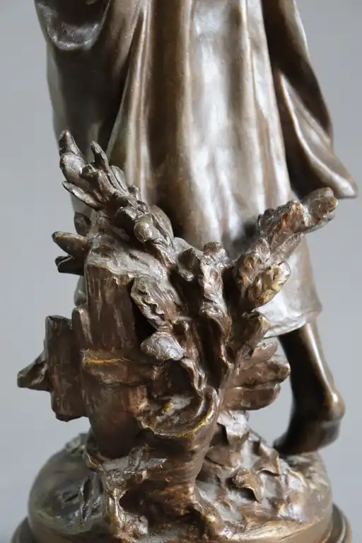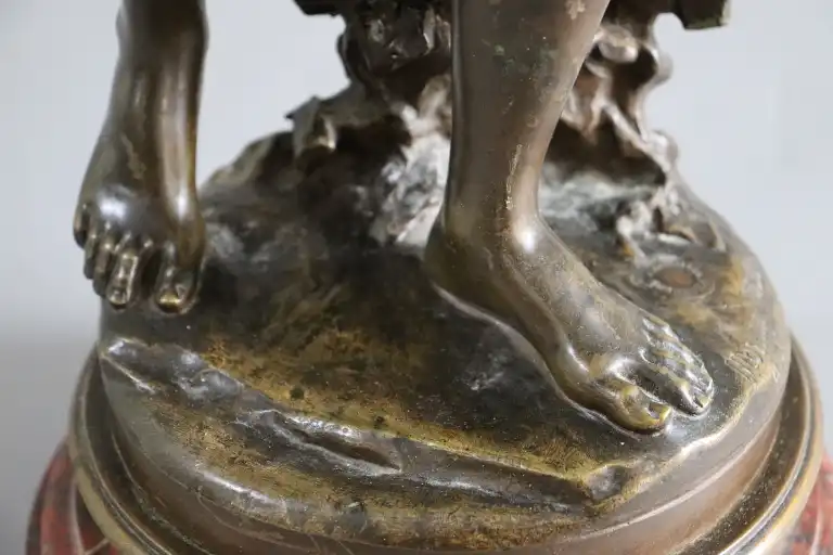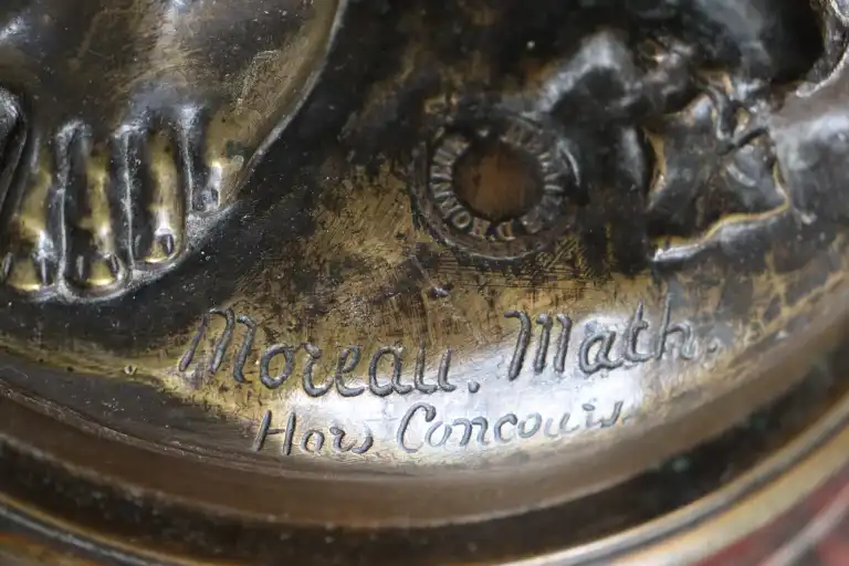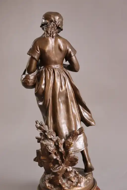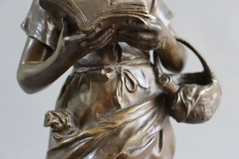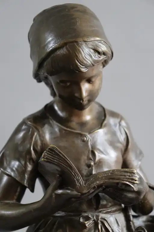 Mathurin MOREAU (1822-1912), d'après. Fillette lisant. Epreuve en bronze à patine brune, signée en creux et la mention hors concours et cachet médaille d’honneur . Contre socle en marbre rouge. H.: 63 cm