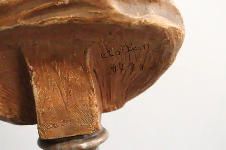 D'après CLODION (1738-1814). Buste de jeune fille drapée. Plâtre patiné portant une signature et datée 1774 à l'arrière. Reposant un socle en colonnette de marbre. H.: 16 cm sans le socle - H. totale : 25 cm