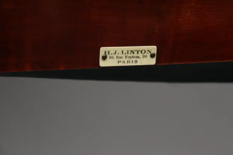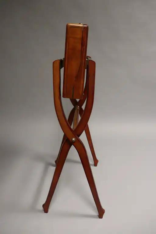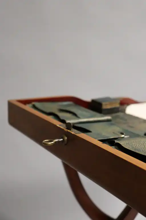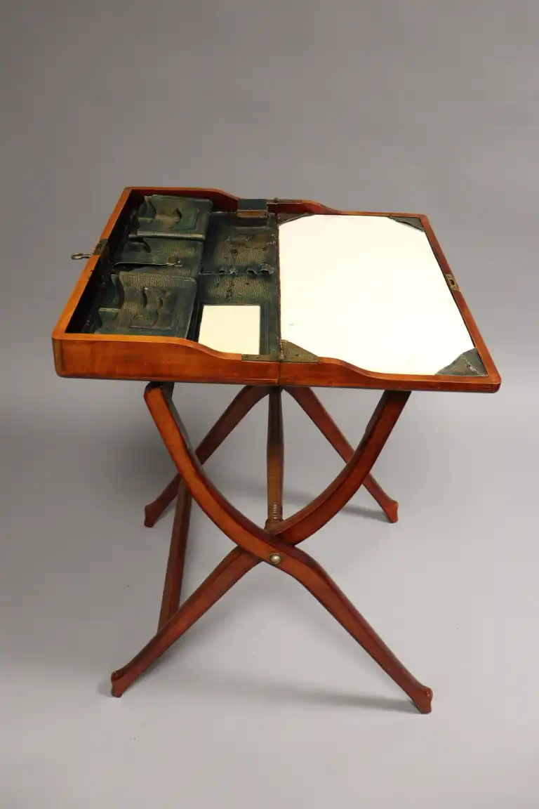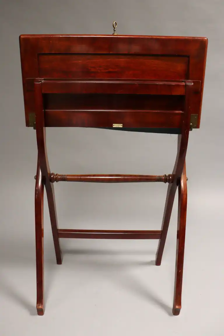H.J. LINTO à PARIS. Petit bureau pliant de voyage ou d'officier en acajou et placage d'acajou, reposant sur un piètement en X à entretoise, l'intérieur garni de cuir formant porte-document, pochettes et divers aménagements pour l'écriture. Avec clef. Signé. Maison Anglaise. H.: 77 cm (ouvert). L.: 54 cm