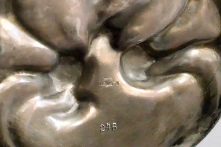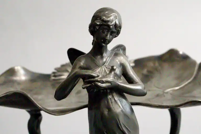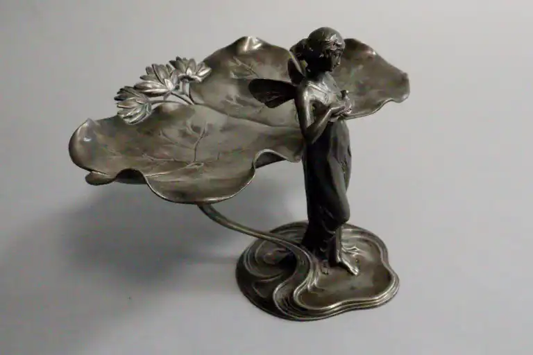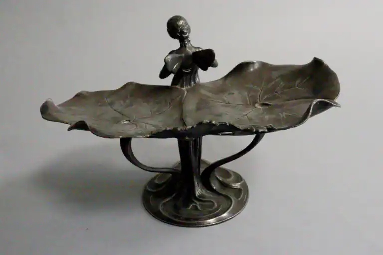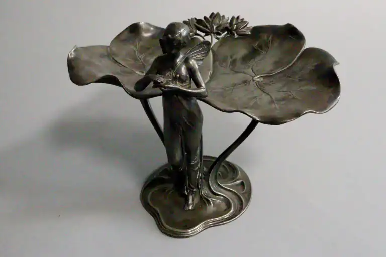 WURTTEMBERGISCHE METALLWARENFABRIK (WMF). Jeune femme au nénuphar tenant une colombe. Porte-cartes en métal argenté. Poinçon sous la base et marqué B et OX, modèle 246. Art Nouveau. Allemagne. H.: 21 cm - L.: 28 cm - P.: 20 cm
