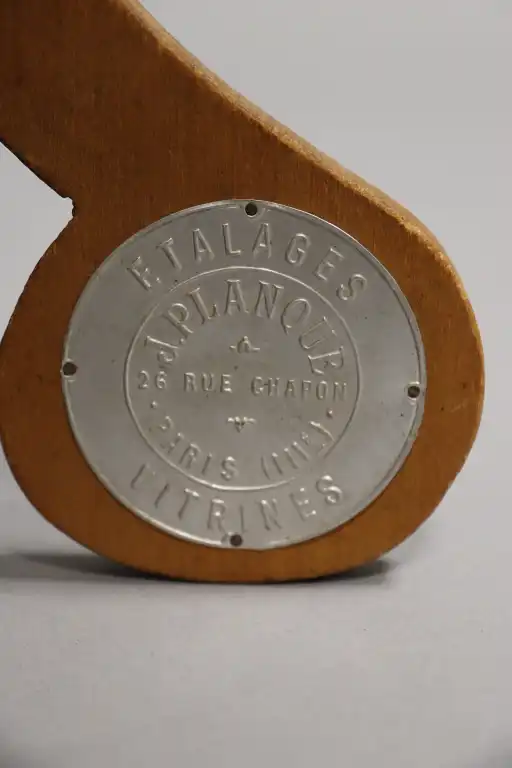 J. PLANQUE à Paris (IIIe). Présentoir à bagues en bois naturel sculpté de fleurs et lignes souples. Garniture de velours jaune. Plaque en métal avec inscription "Etalages vitrines" à l'arrière. Travail Art Nouveau. H.: 31.5 cm