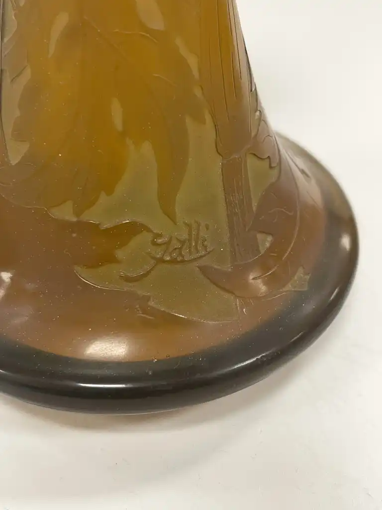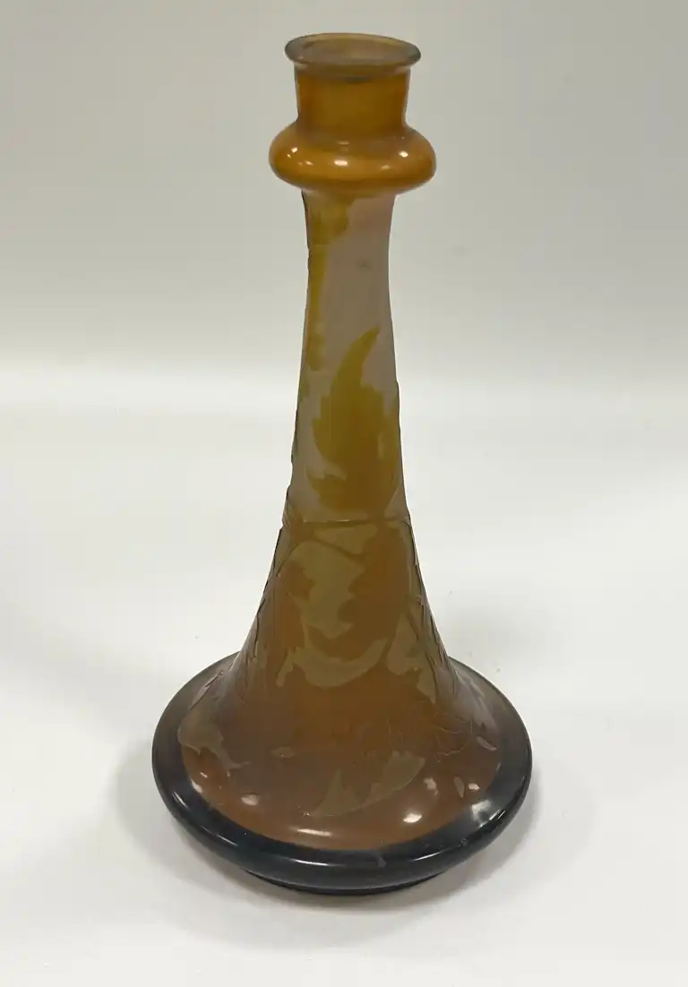 Etablissement Emile GALLE (1904-1936). Vase soliflore tronconique en verre multicouche à décor dégagé à l'acide d'ombellifères dans les tons roses orangés. Signé "Gallé" dans le décor. H.: 22 cm