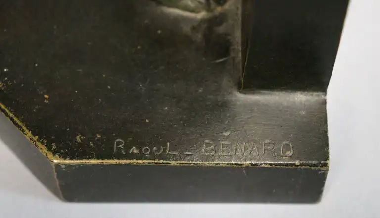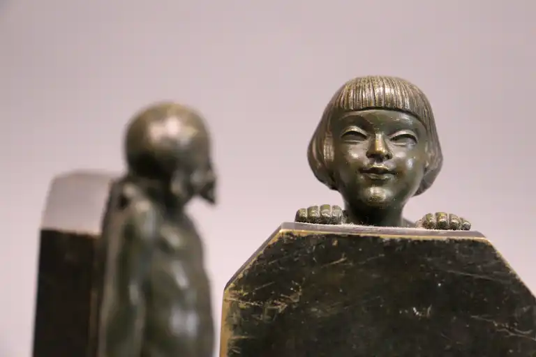Raoul BENARD (1881-1961). Jeunes enfants allant au bain. Paire de serre-livres en bronze nuancé vert, signés. H. : 22.5 cm