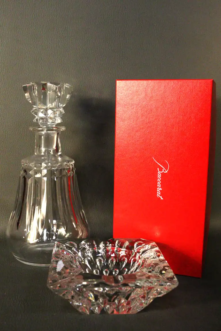 BACCARAT. Lot comprenant : - Carafe en cristal taillé avec son bouchon, numéroté 28. Estampillée sous la base. (Eclat au bouchon). H.: 25 cm ;