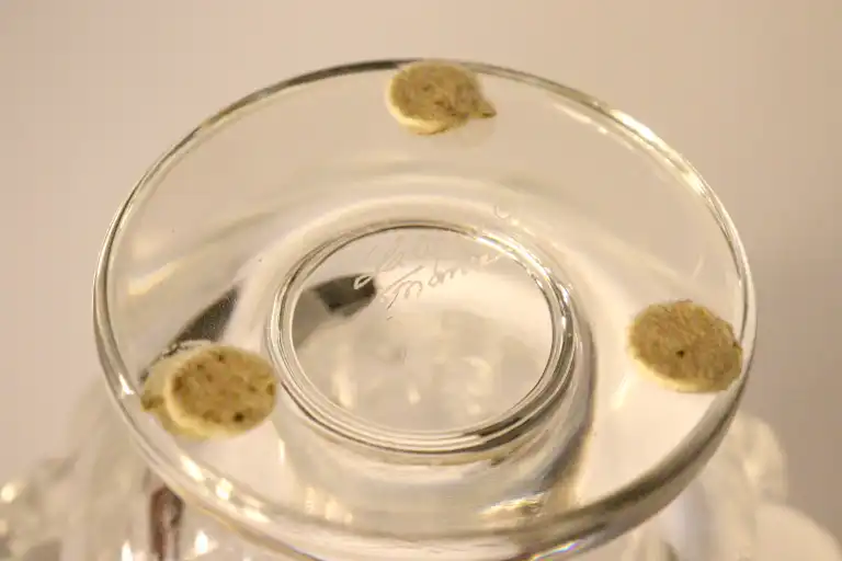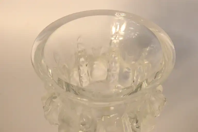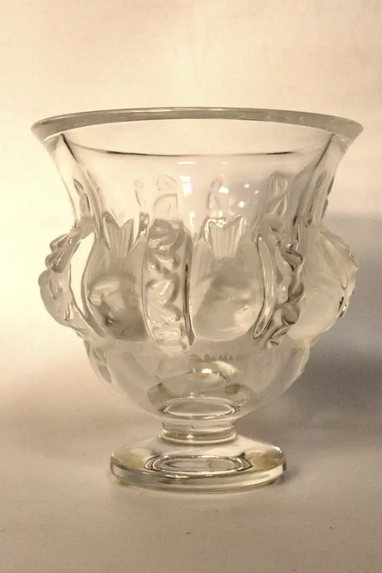 LALIQUE France. Modèle Dampierre (créé en 1948). Vase en cristal moulé pressé à décor de moineaux en relief. Signé. H.: 12,5 cm - D.: 11,9 cm