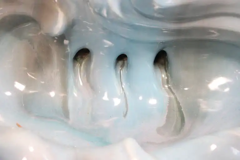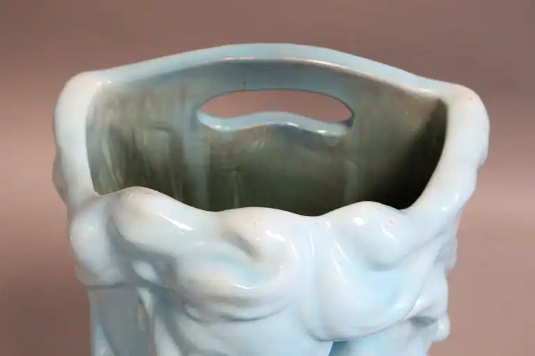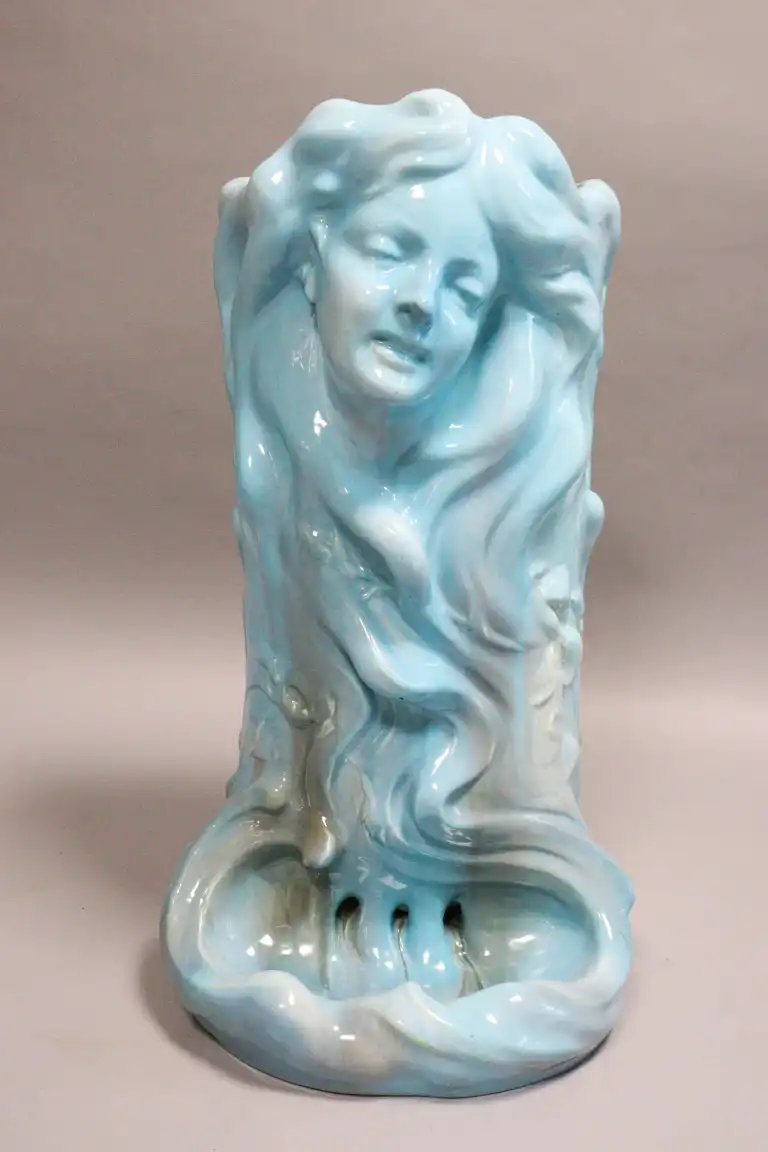 Delphin MASSIER (1836-1907) à Vallauris. Porte-parapluie en céramique émaillée bleue figurant un visage de femme à la longue chevelure. Prise de transport à l'arrière. La base formant réceptacle. Modèle 1418 de la planche 27 du catalogue de Massier. H. : 67 cm