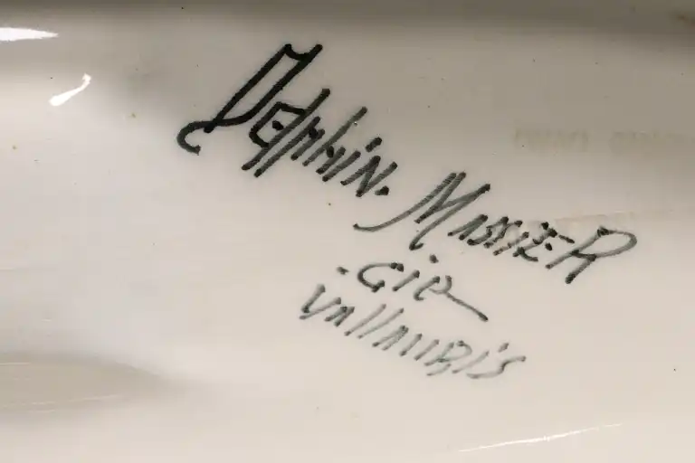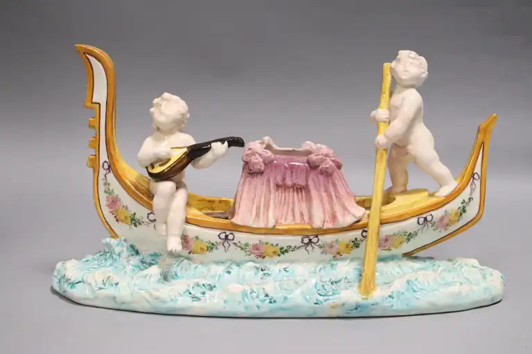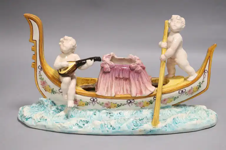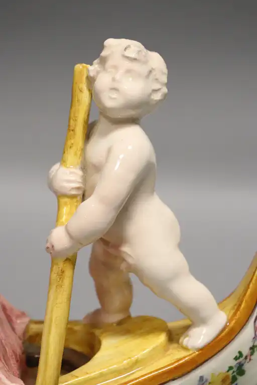 Delphin MASSIER (1836-1907) à Vallauris. Deux amours sur une gondole en céramique émaillée polychrome. Signée sous la base. L. : 42 cm