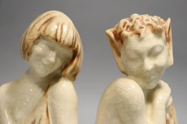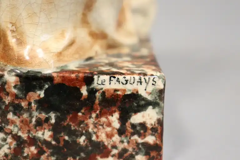 Pierre LE FAGUAYS (1892-1962) dit FAYRAL. Paire de serre-livres en faïence polychrome figurant une nymphe et un faune. Signé. H. : 21.5 cm