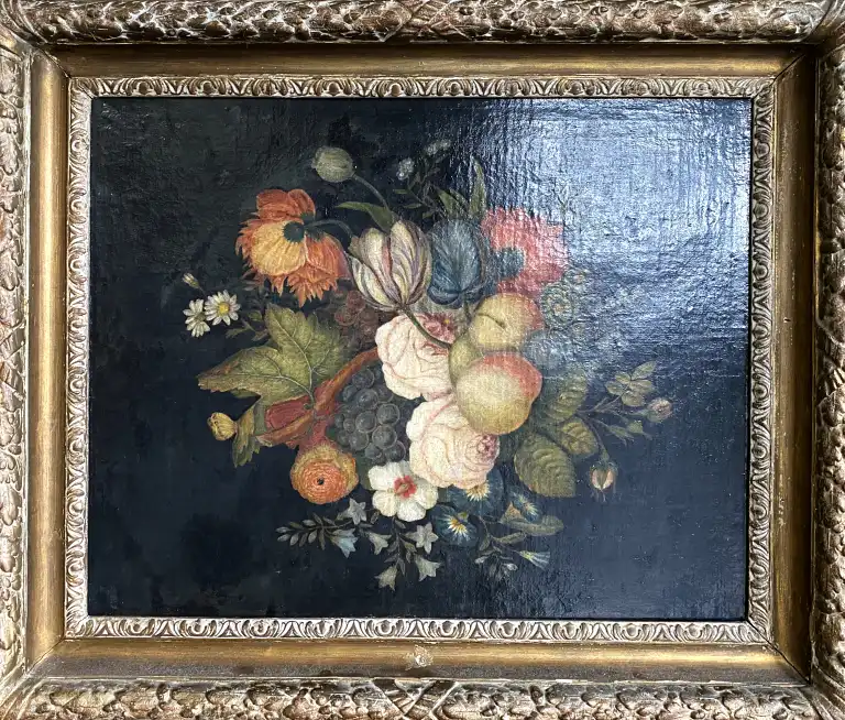 Ecole de la fin XIXème siècle (dans le goût Flamand). Nature morte aux fleurs et aux fruits. Huile sur toile. 53 x 64 cm (Réentoilée)