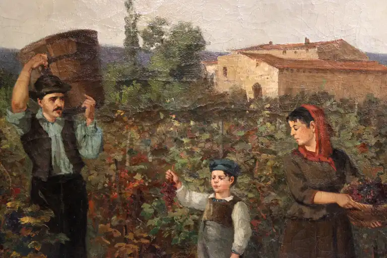 MALLET (XXème siècle). Famille de vignerons aux vignes. Huile sur toile, signée en bas à gauche. 131 x 94 cm