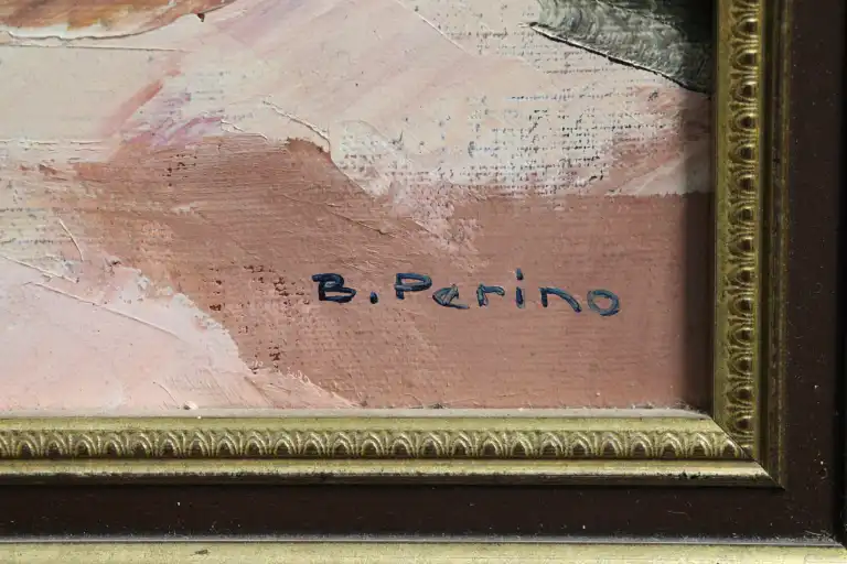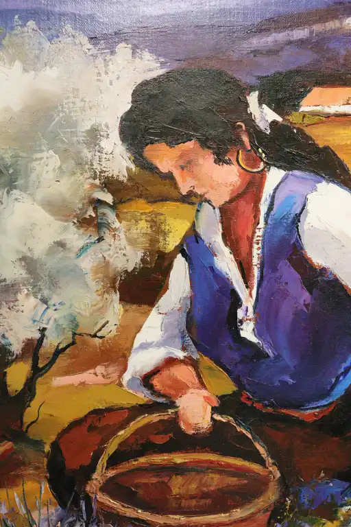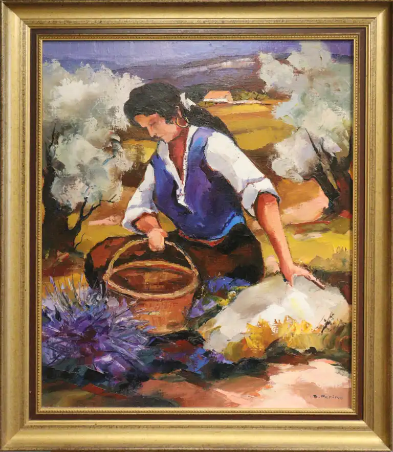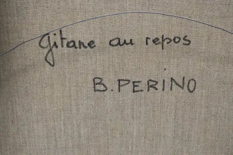 Bruno PERINO (1925) : Gitane au repos. Huile sur toile, signée en bas à droite, contresignée et titrée au dos. 65 x 54 cm