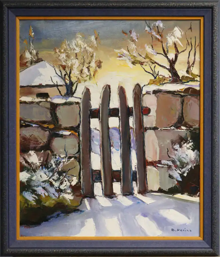Bruno PERINO (1925-1996). Portail sous la neige. Huile sur toile, signée en bas à droite et titrée au dos sur le châssis. 55 x 46 cm