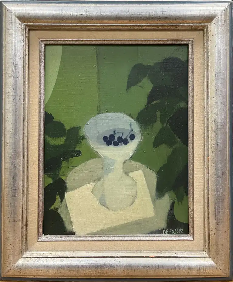 Freddy DEFOSSEZ (né en 1932). Nature morte aux cerises bleues. Huile sur toile, signée en bas à droite. 35 x 27 cm