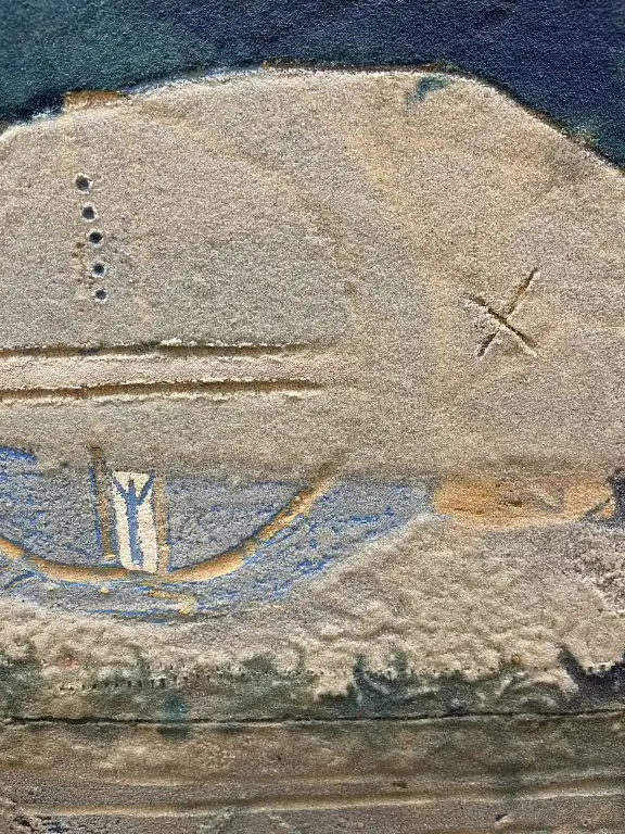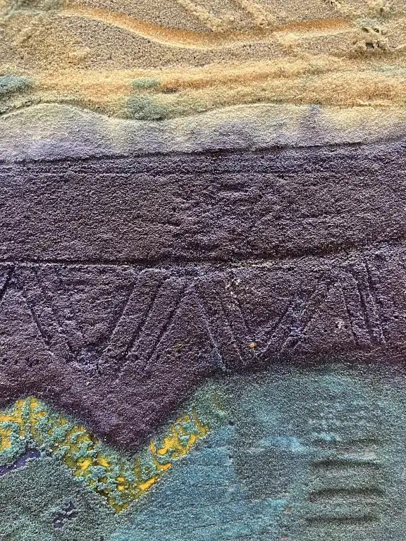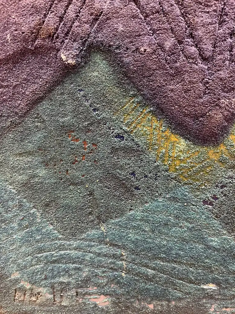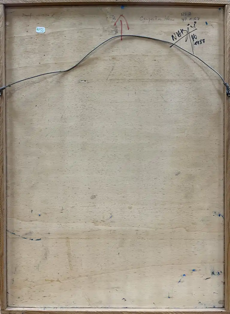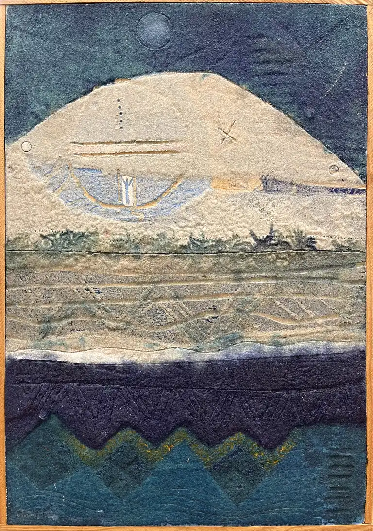 Mohamed NABILI (1954-2012). Composition bleue, 1987. Technique mixte collage de sable du Sahara, signée en bas à gauche, contresigné, datée et titrée au dos. 45 x 65 cm