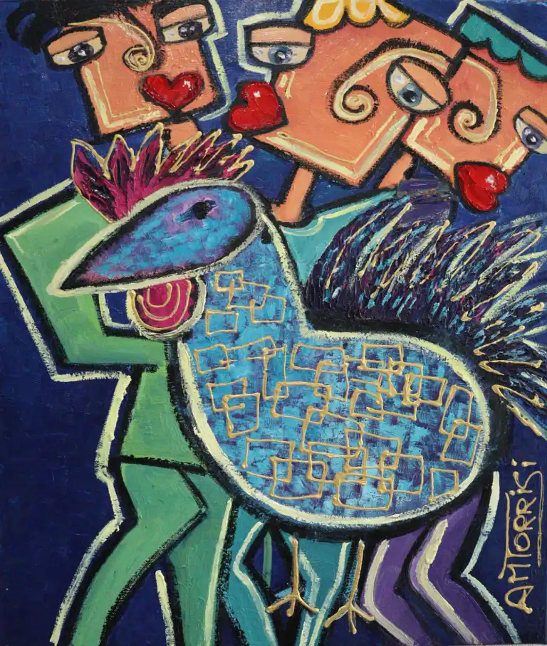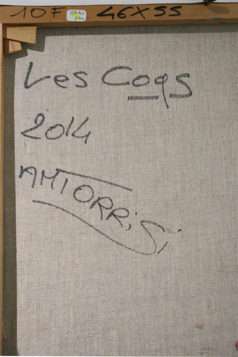 Anne-Marie TORRISI (née en 1965). Les Coqs, 2014. Huile sur toile, signée en bas à droite, contresignée, titrée et datée au dos. 55 x 46 cm