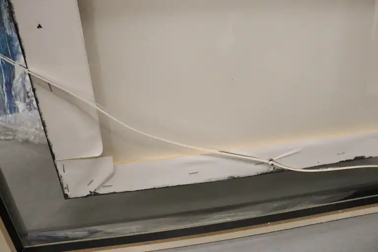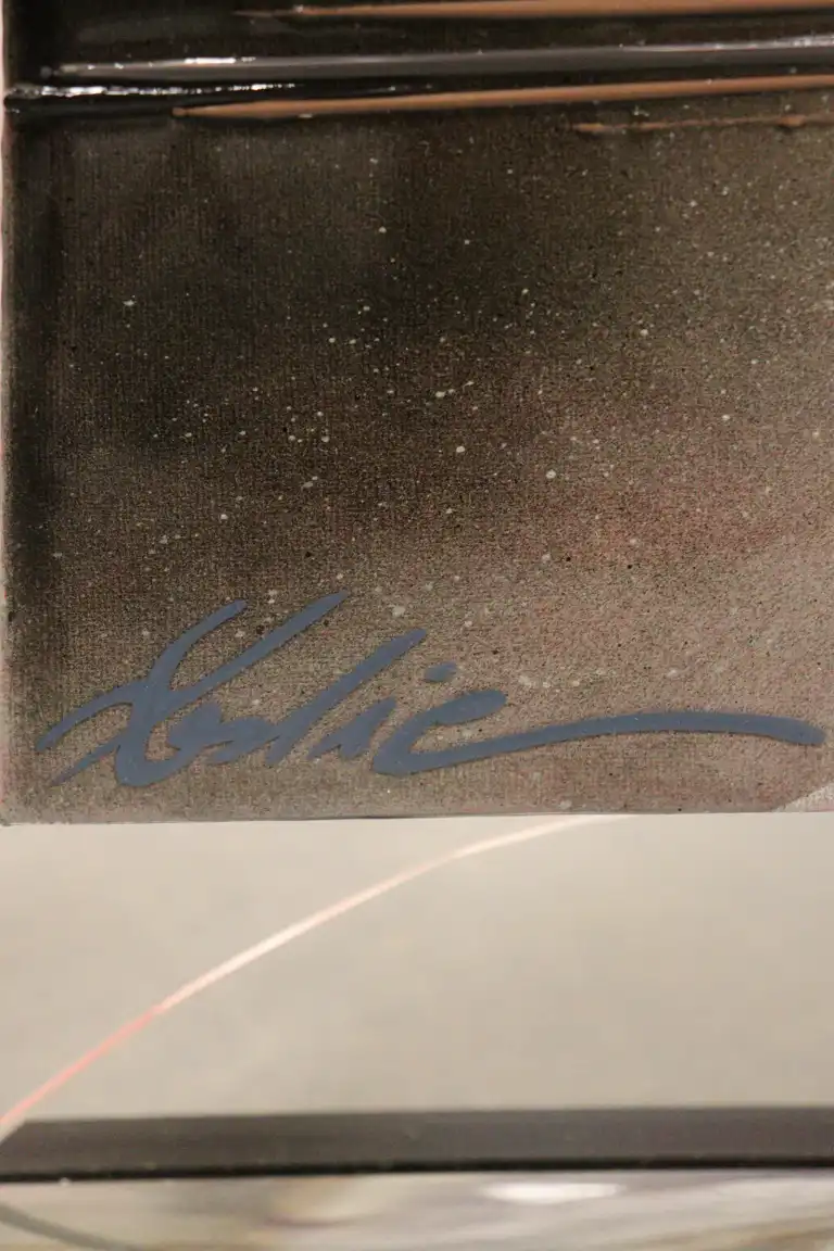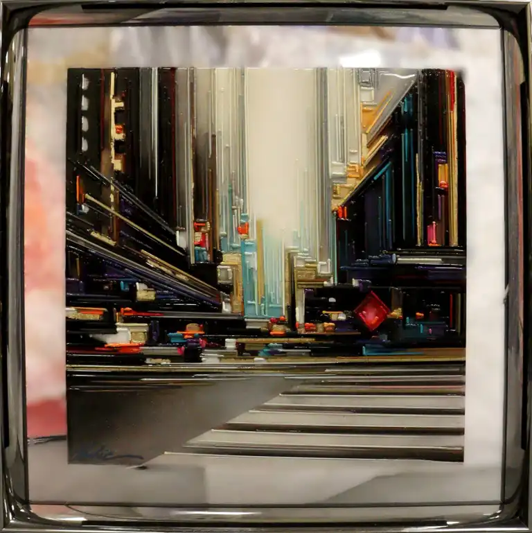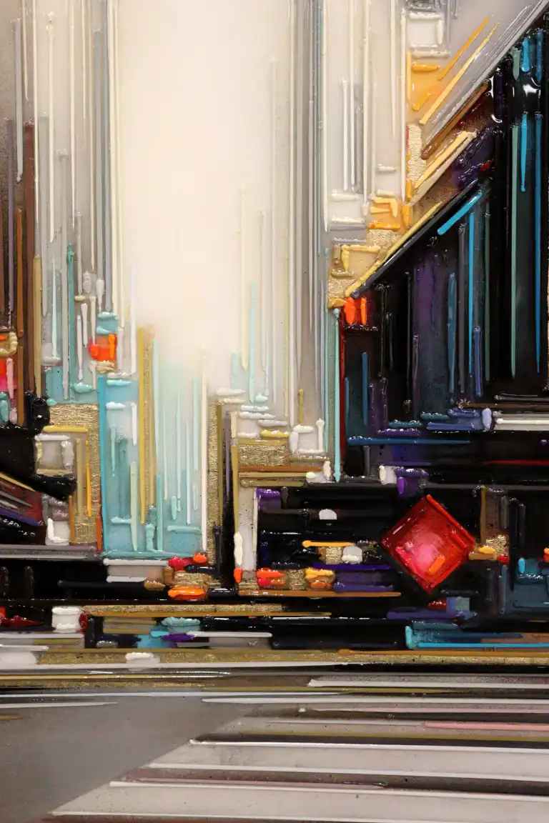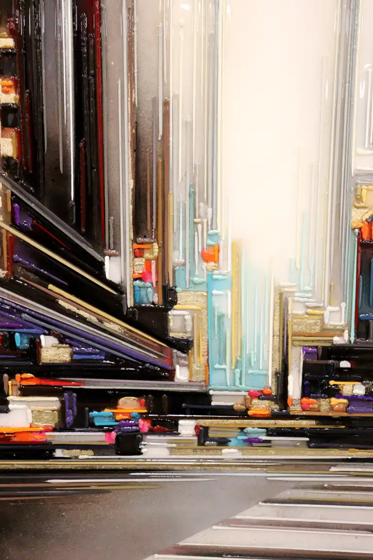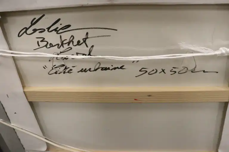 Leslie BERTHET LAVAL (1975 - ). Cité Urbaine. Acrylique sur toile, signée en bas à gauche, contresignée et titrée au dos. 50 x 50 cm (verre du cadre à changer)