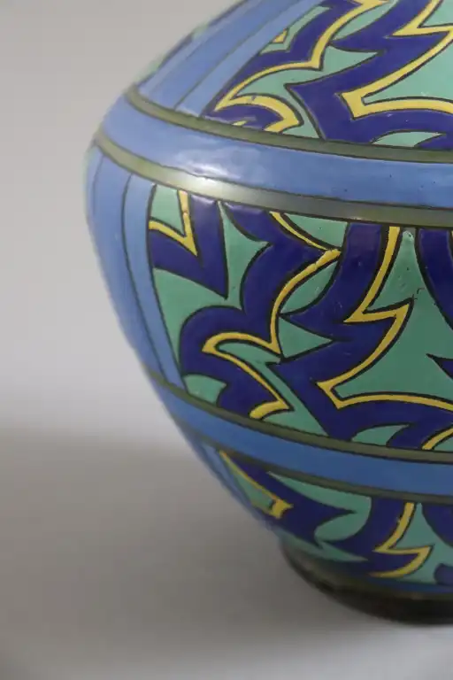 LEUNE. Vase balustre à col légèrement renflé en verre à décor émaillé de motifs stylisés dans les tons bleus. Signé. H.: 30 cm (Quelques légères usures d'émail)
