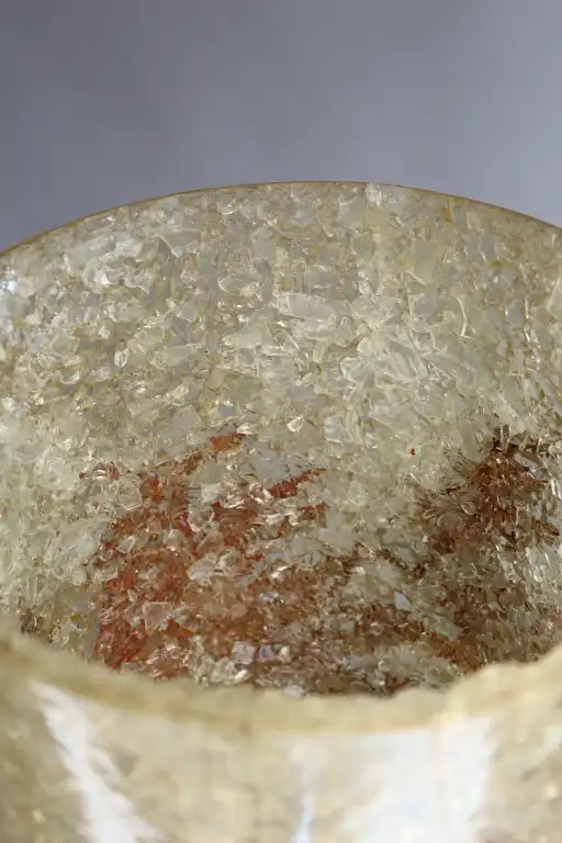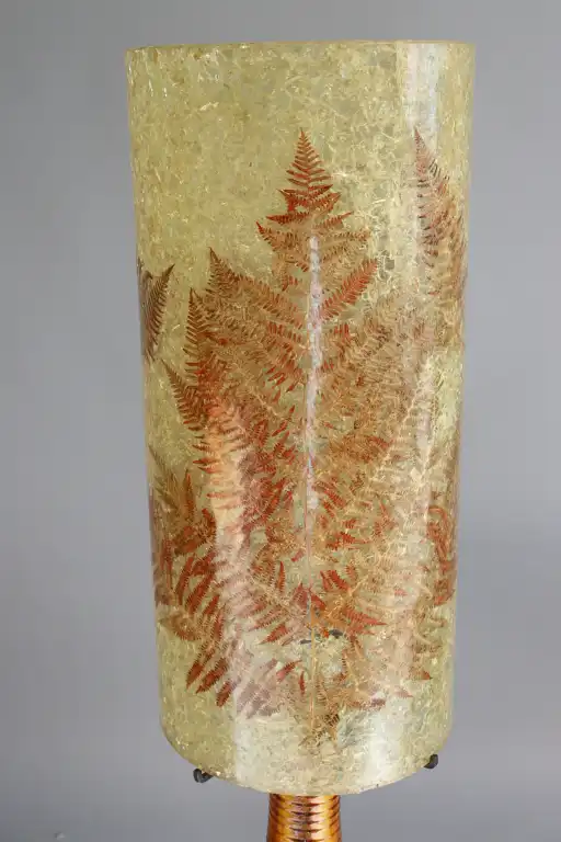 ACCOLAY. Lampe grand modèle en grès. L'abat-jour tubulaire en verre coloré façon granité à décor de fougères. Tavail des années 1970. H.: 120 cm
