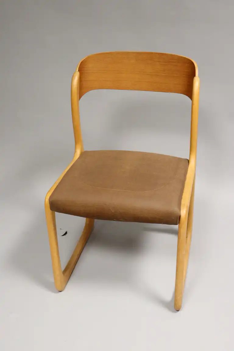 BAUMANN. Modèle traineau. Suite de six chaises en hêtre, les assises garnies de tissu marron. H.: 80,5 cm - L.: m - P.: 45 cm