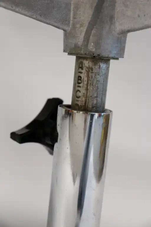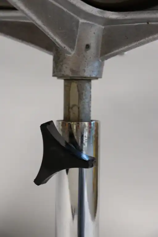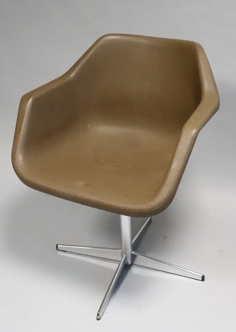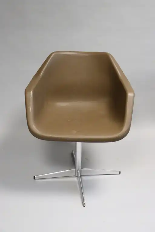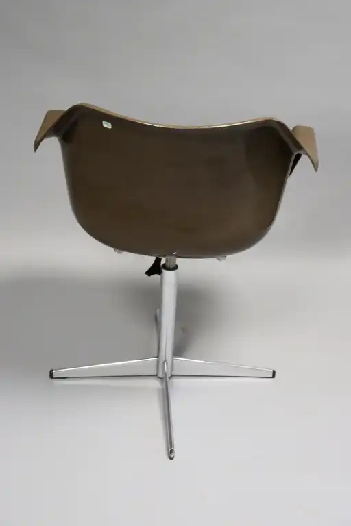 ROBIN DAY (1915-2010). Edition HILLE. Fauteuil marron en plastique thermomoulé, réglable et pivotant, le piètement croix en métal. Estampillé sous l'assise. H.: 77 cm - L.: 60 cm - P.: 41,5 cm (plastique noir accidenté au pied, usure piètement, l'assise se déforme)