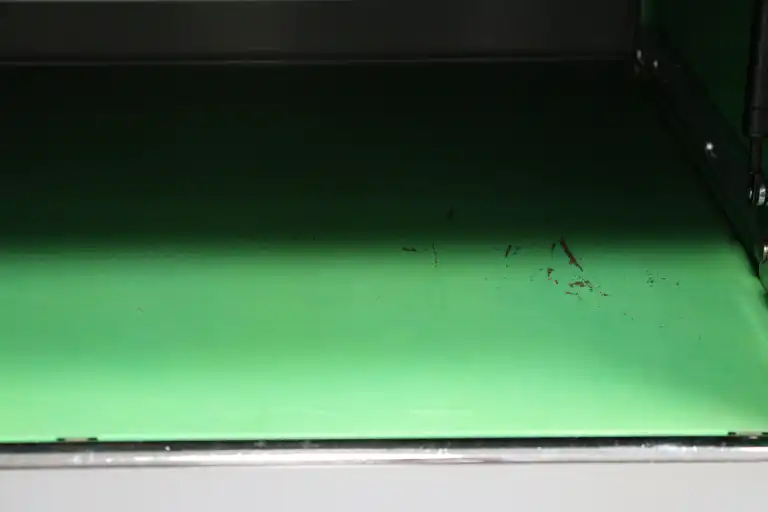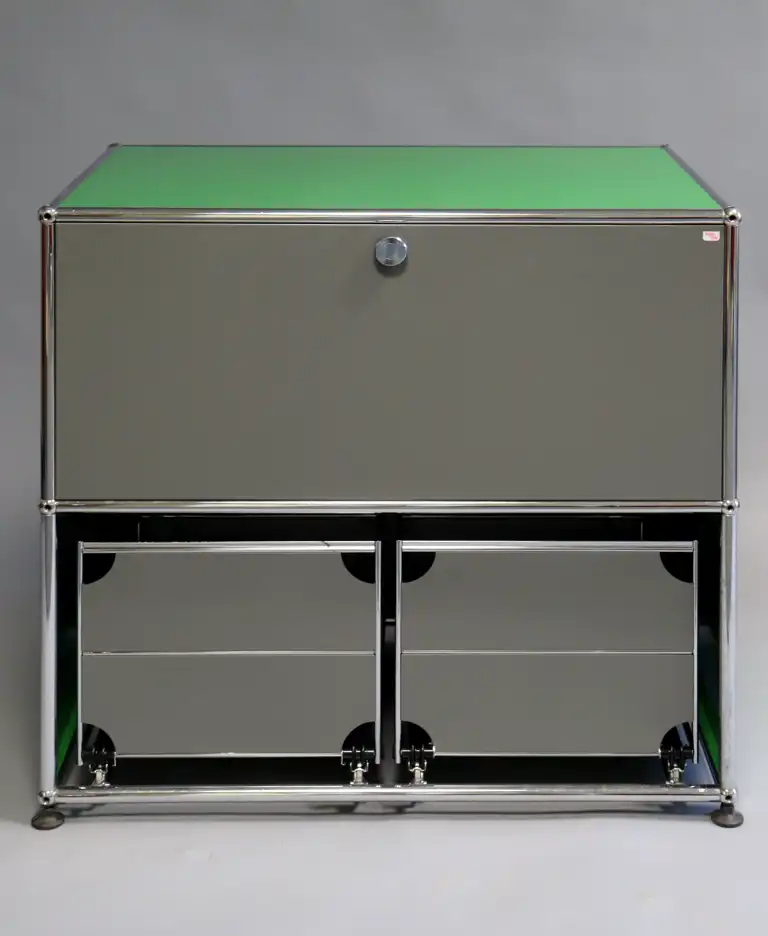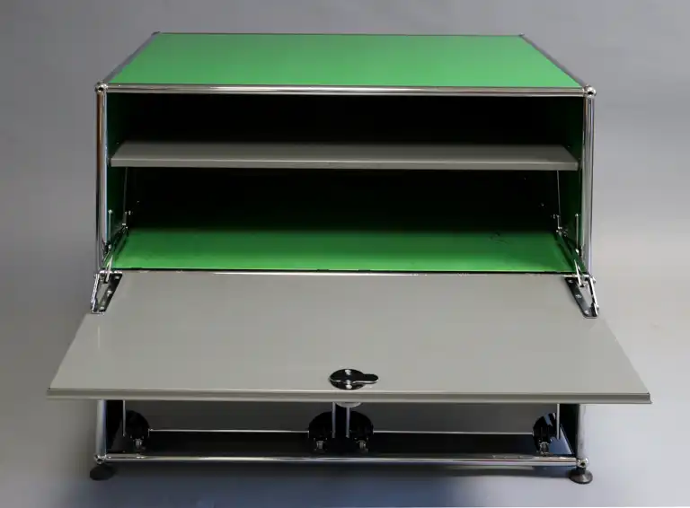 USM Haller. Meuble de bureau classeur à structure tubulaire modulaire en acier chromé et panneaux laqués verts et gris, à un clapet et deux tiroirs. H.: 75 cm - L.: 77 cm - P.: 52 cm