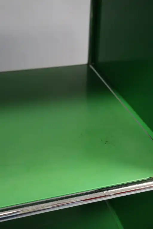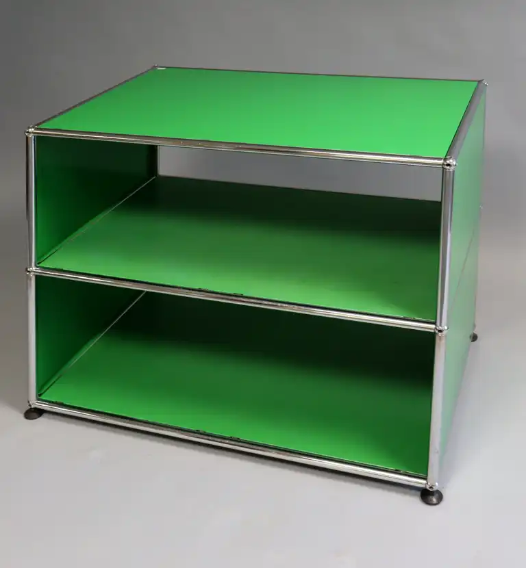 USM Haller. Meuble de bureau à structure tubulaire modulaire en acier chromé et panneaux laqués verts à deux étages. H.: 75 cm - L.: 77 cm - P.: 52 cm