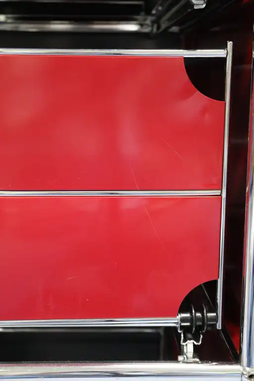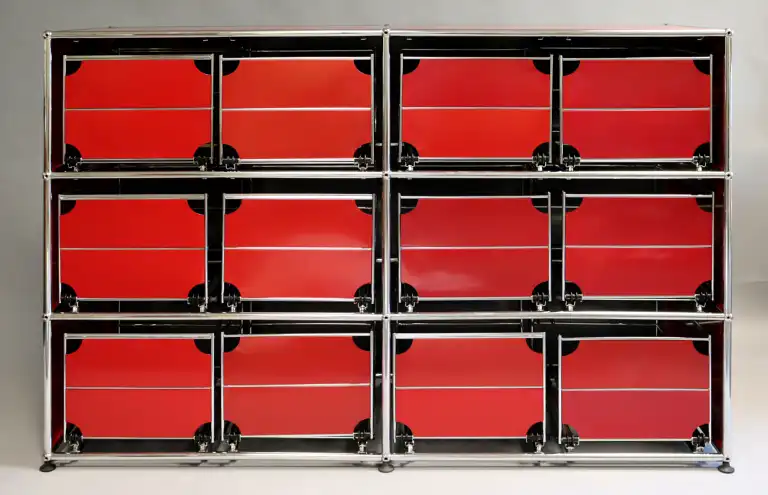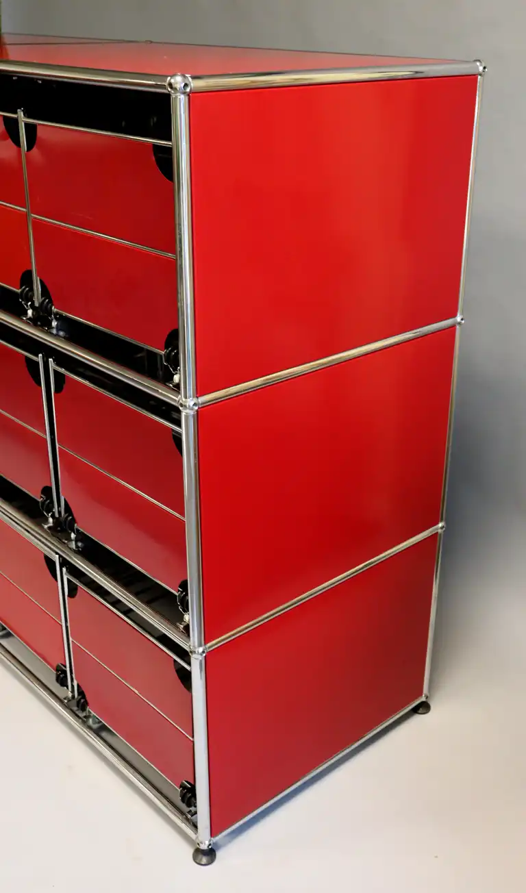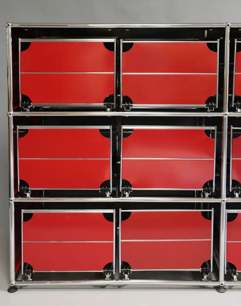 USM Haller. Buffet classeur à hauteur d'appui à structure tubulaire en acier chromé et panneaux laqués bordeaux. H.: 109 cm - L.: 152 cm - P.: 52 cm