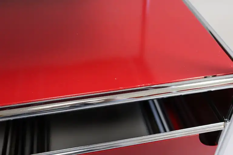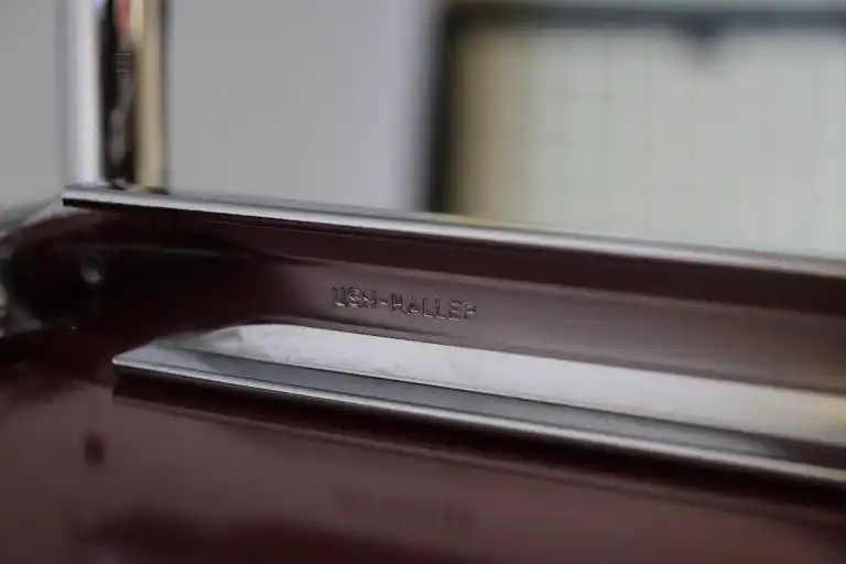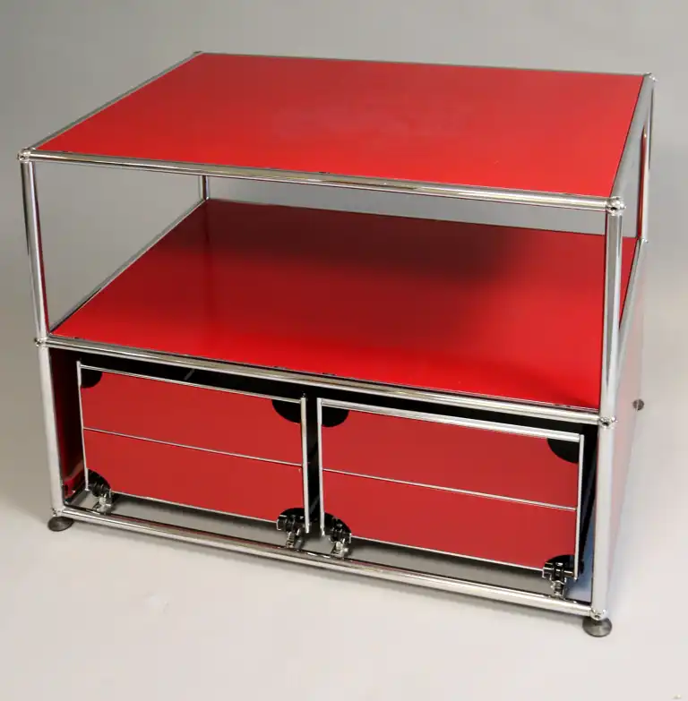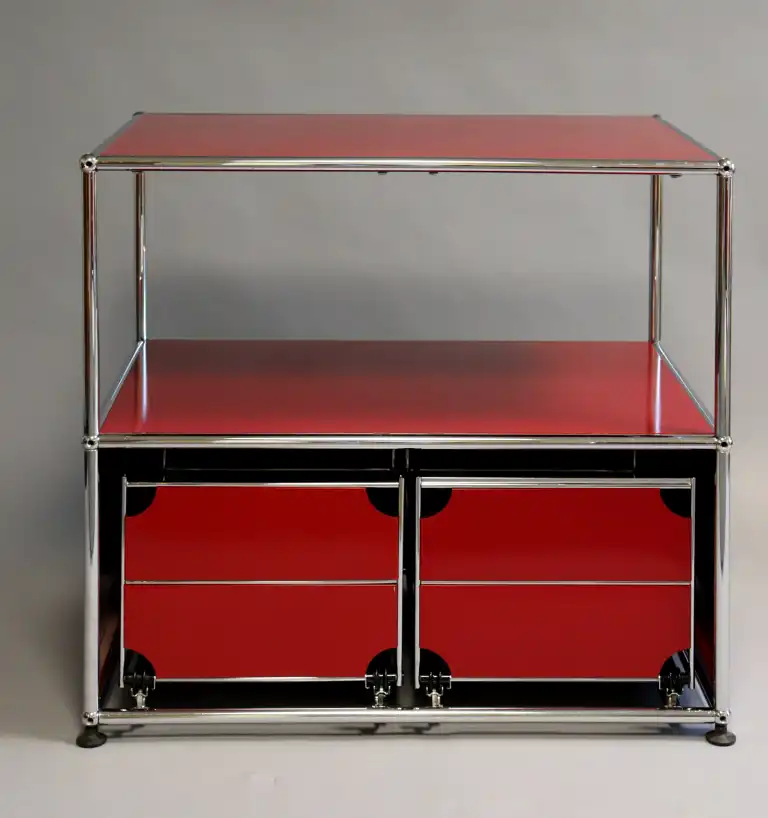 USM Haller. Buffet étagère classeur à structure tubulaire modulaire en acier chromé et panneaux laqués bordeaux. H.: 74 cm - L.: 77 cm - P.: 52 cm