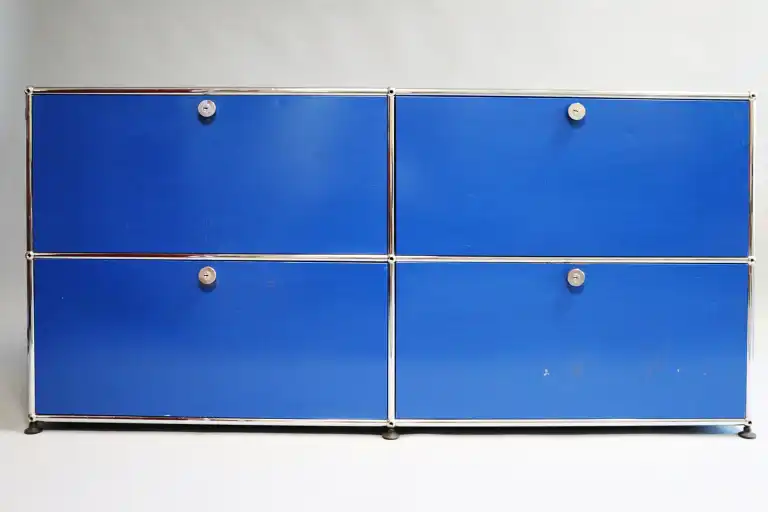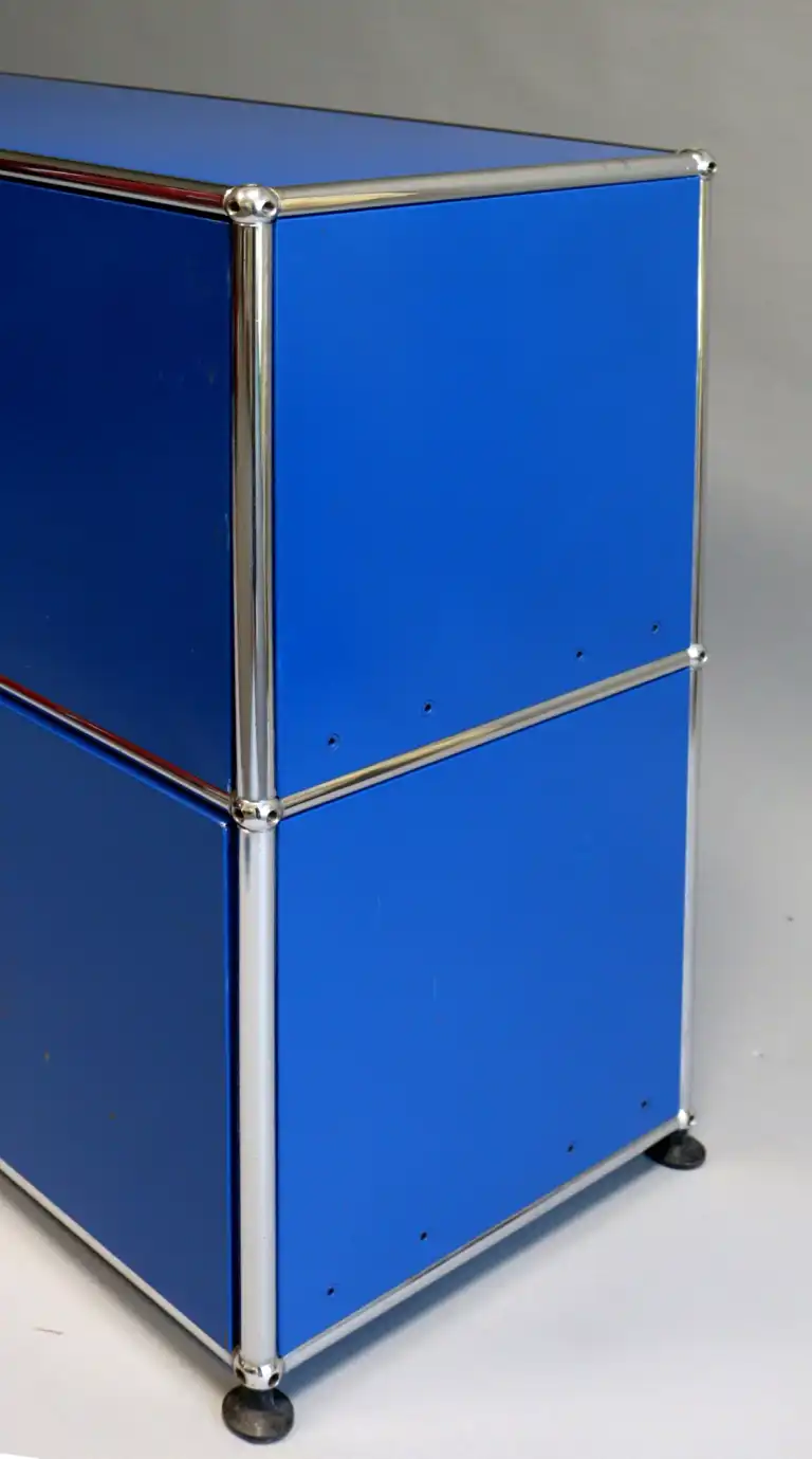 USM Haller. Buffet bas à quatre portes à structure tubulaire en acier chromé et panneaux laqués bleus. H.: 75 cm - L.: 151 cm - P.:37.5 cm