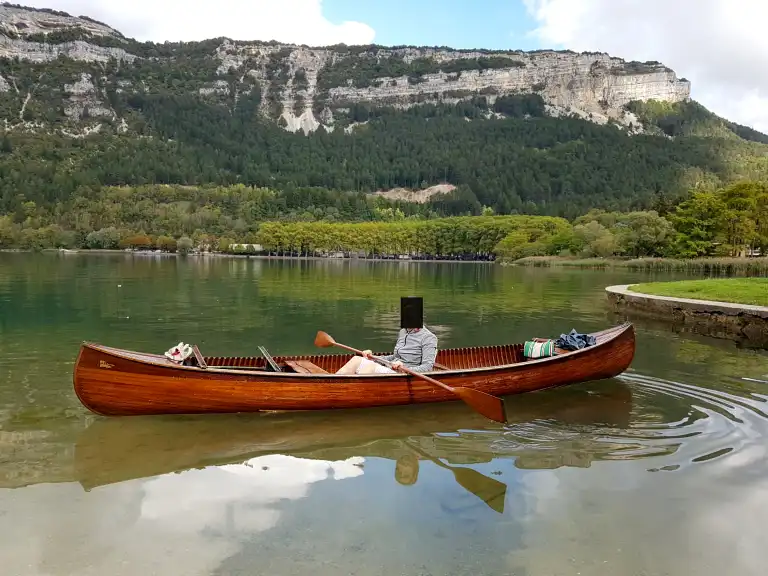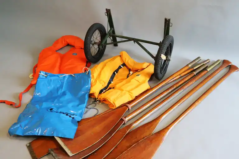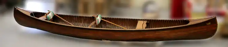 ARMOR (S.E.B.A). Canoë en bois. Equipé de six rames, deux sièges à lattes, deux bancs en bois, sac avec gilets de sauvage, tissus et coussins, charriot de transport du canoe. L.: 468 cm - Larg.: 93 cm - H.: 31 cm