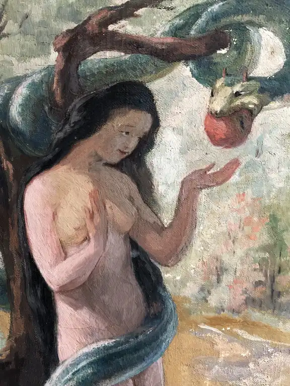 Louise COTTIN (1907-1974). Eve au serpent. Huile sur toile, signée en bas à droite avec la mention "Prix de Rome".