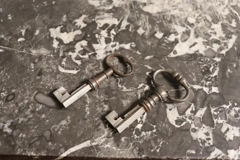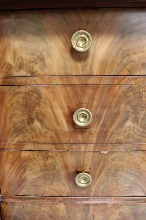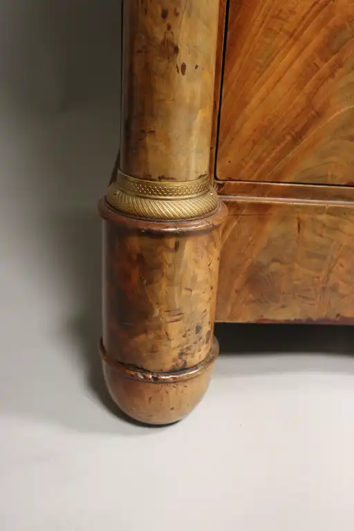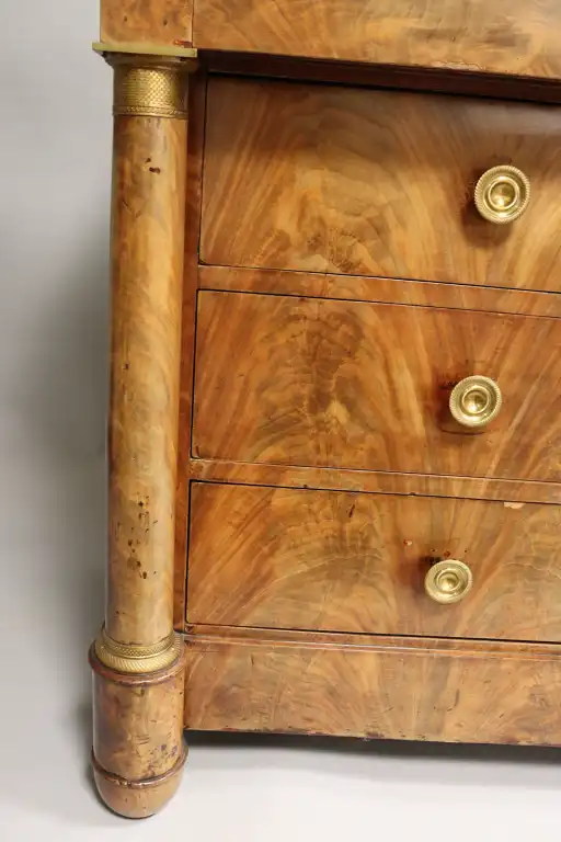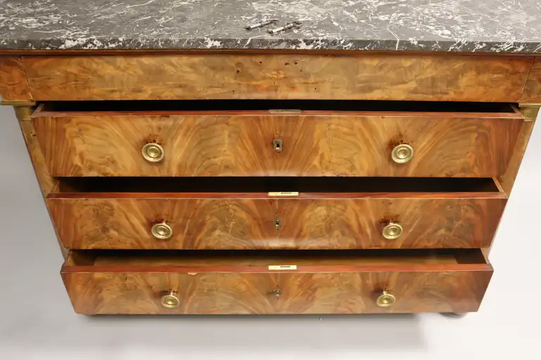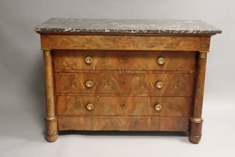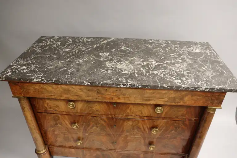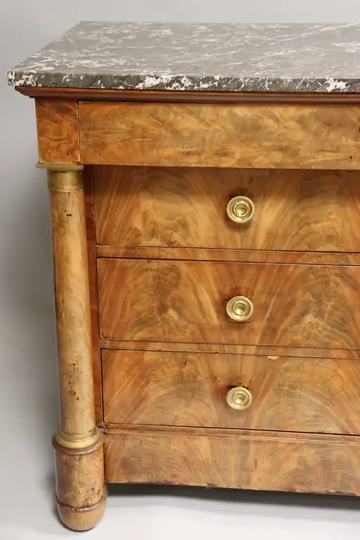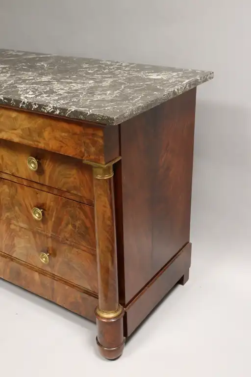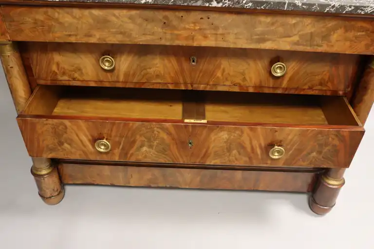 Commode en acajou et placage d’acajou (accidents et fentes), ouvrant par quatre tiroirs sur quatre rangs, montants à colonnes détachées. Poignées de tirage et bagues en bronze ciselé et doré. Epoque Restauration. Plateau de marbre gris veiné blanc. 90 x 130 x 60 cm