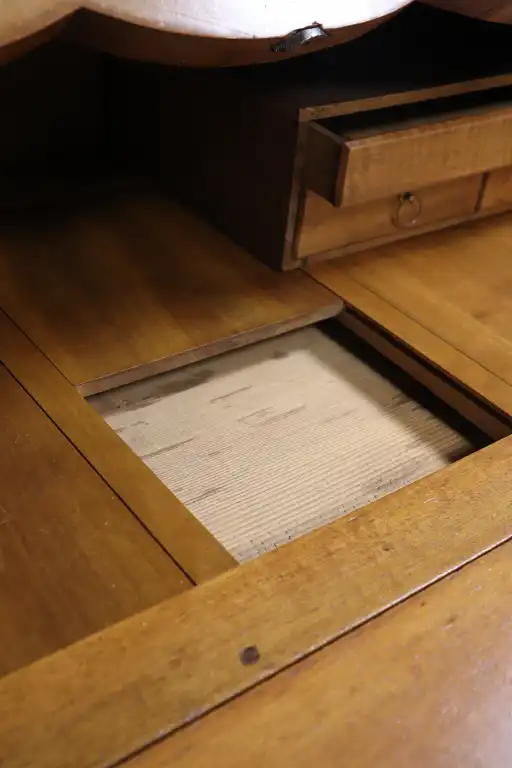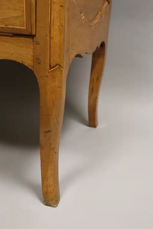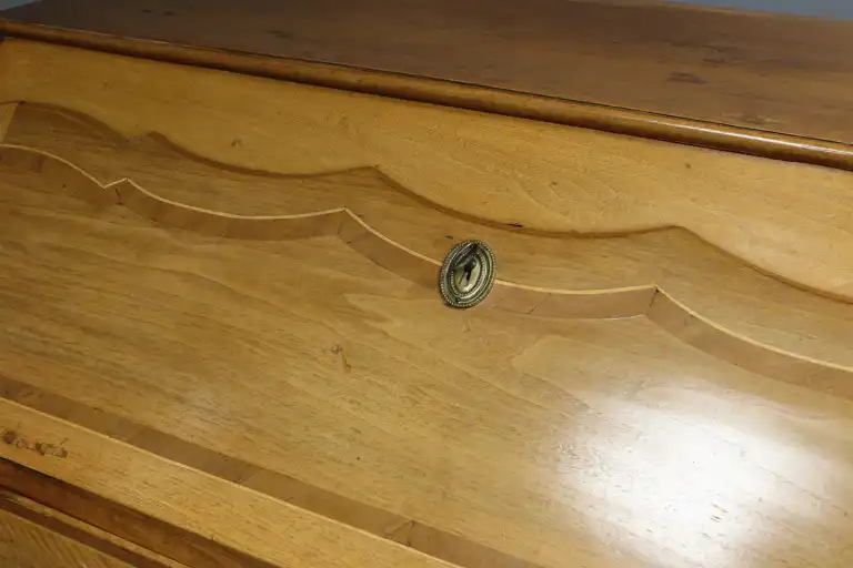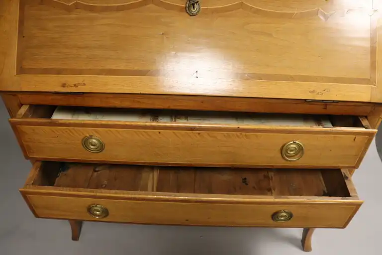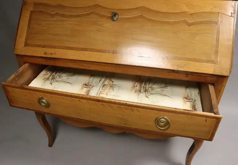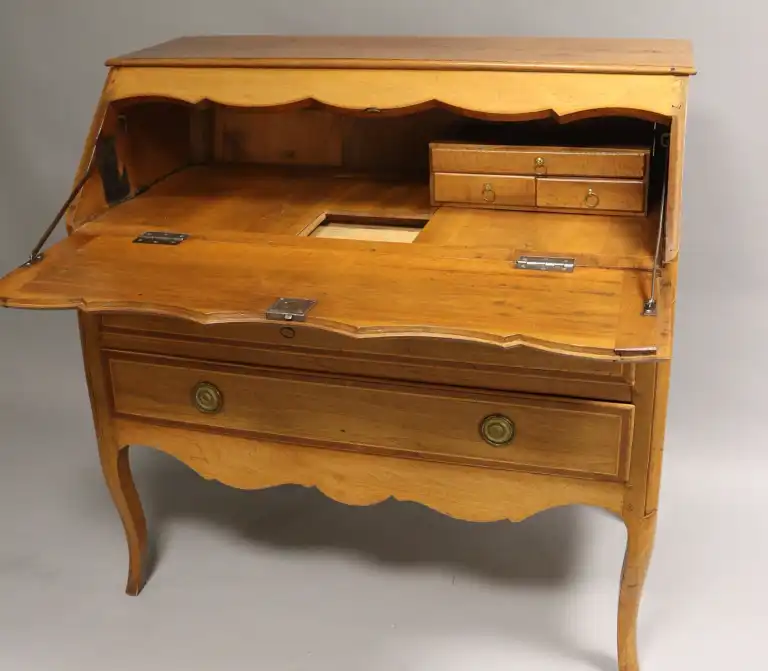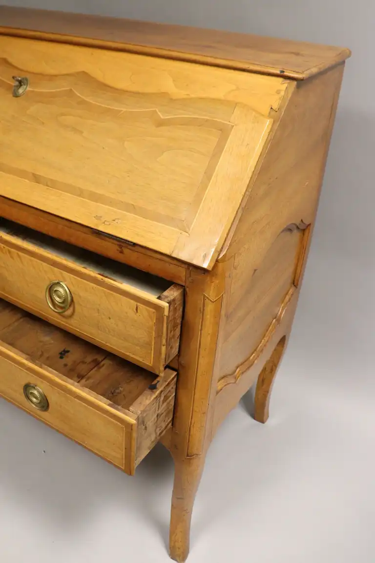 Scriban en noyer mouluré, marqueté de bois indigène, ouvrant par un abattant et deux tiroirs sur deux rangs, pieds cambrés. Entrées de serrure et anneaux de tirage en laiton. Style Louis XV. 114 x 114 x 57 cm