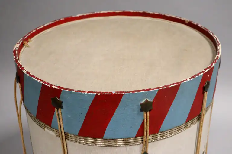 Tambour major à décor de soldats napoléoniens, agrémenté de cordes. H. : 50 cm - D. : 39 cm (Certaines cordes cassées, usage)