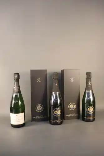3 bouteilles : Champagne, Baron de Rothschild, Brut, avec emboitage (x2) - Champagne, René Dosne, Tradition, Brut (x1)