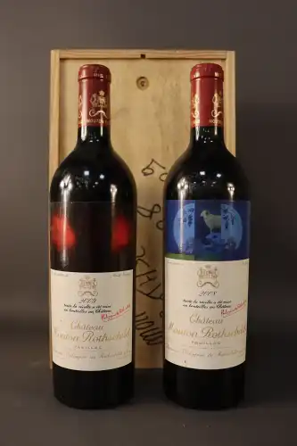 2 bouteilles : Château Mouton Rothschild, Pauillac, 2009 (bg) - Château Mouton Rothschild, Pauillac, 2008 (bg, ela)