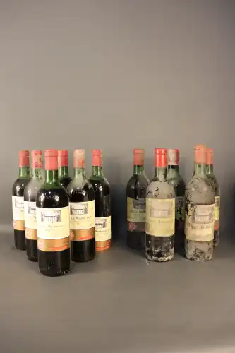 11 bouteilles : Chambolles Musigny, Rossigneux et Fils, 1970 (x3) (3eta, 1ca, 2 colerettes manquantes, 2x3cm, 1x6cm) - Mercurey, 1962 (x3) ( 2eta, 1 sans étiquette, 3ca, 2x5cm, 1x6cm) - Saint Romain, Côte de Beaune, 1971 (x2) (2eta, manque 1 collerette, 2ca, 1x4cm, 1x5cm) - Bourgogne Geisweiler (x1) (eta, ca, 3cm) - Domaine de la Grande Ribe, Côte du Rhônes, 1972 (x1) (eta, colerette, ca, 4cm) - Clos de l'Oratoire des Papes, Chateau Neuf du Pape, 1971 (x1) ( eta, et, 3cm)