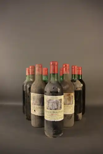 10 bouteilles : Château Beausejour, Pomerol, 1971 (étiquettes très abimées, 6 étiquettes manquantes, 2ca, 8bg, 2me, 1be)
