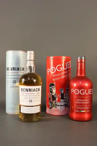 2 bouteilles : Benriach, 1898, The Origial Ten, 10 years of age, Speyside Single Malt Scotch Whisky, avec emboitage - The Pogues, Single Malt Irish Whisky, avec emboitage