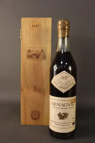 1 bouteille : Château de Laubade, Bas Armagnac, 1937, mis en bouteille en fevrier 1988, (dans son coffret bois), étiquette et capsule légèrement abimée,