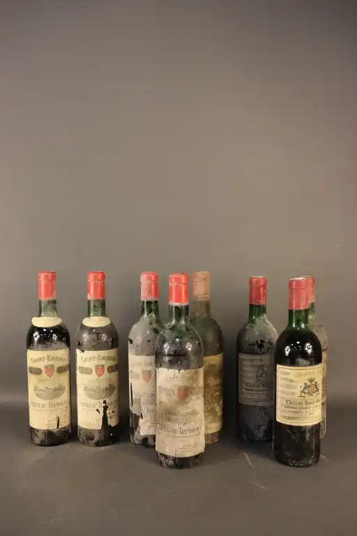 8 bouteilles : Château Haut Monpezat, Bordeaux supérieur, Côte de Castillon, 1970 (x3) (3et, 3ea, 3me) - Château Trimoulet, Saint Emilion Grand Cru, 1967 (x2) (2et, 1ea, 1eta, 2he) - Château Trimoulet, Saint Emilion Grand Cru, 1962 (x3) (3et, 3eta, 2ca, 2me, 1be)