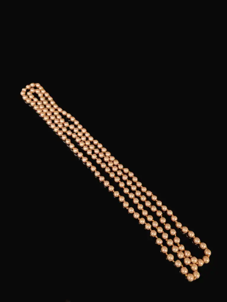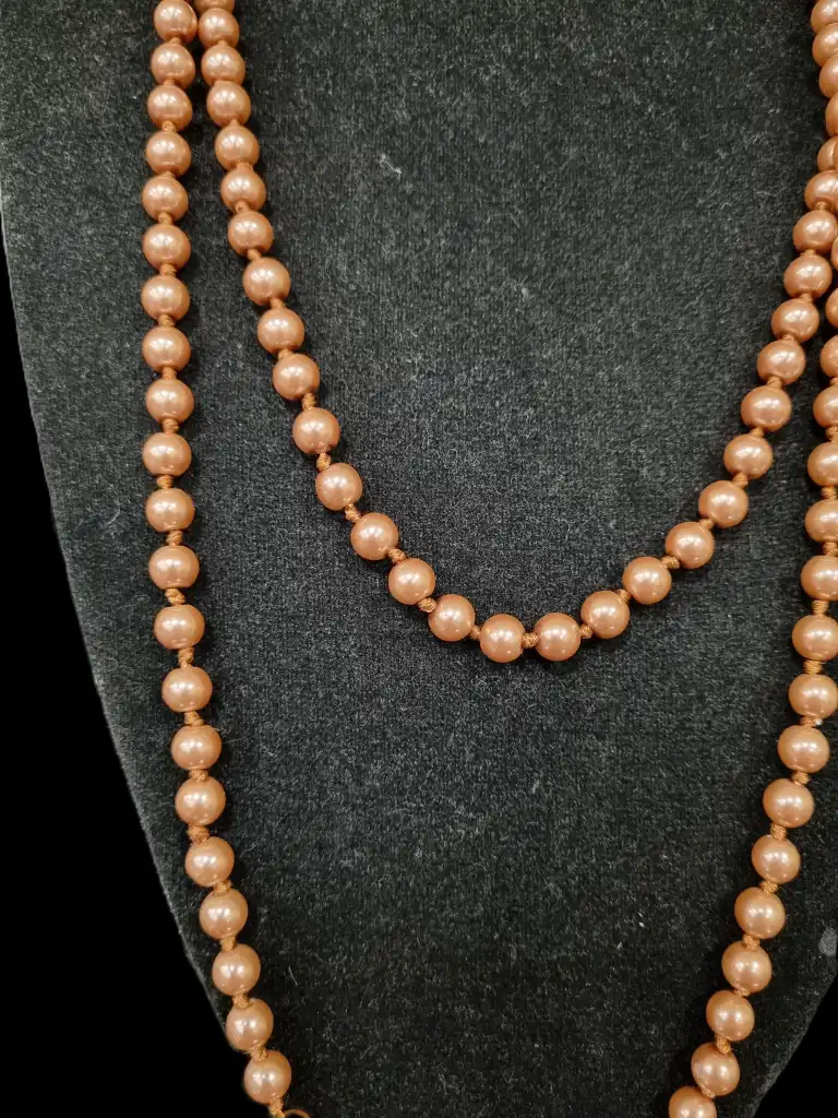 Long collier sautoir en perles fantaisie de couleur rose. L. : 77 cm