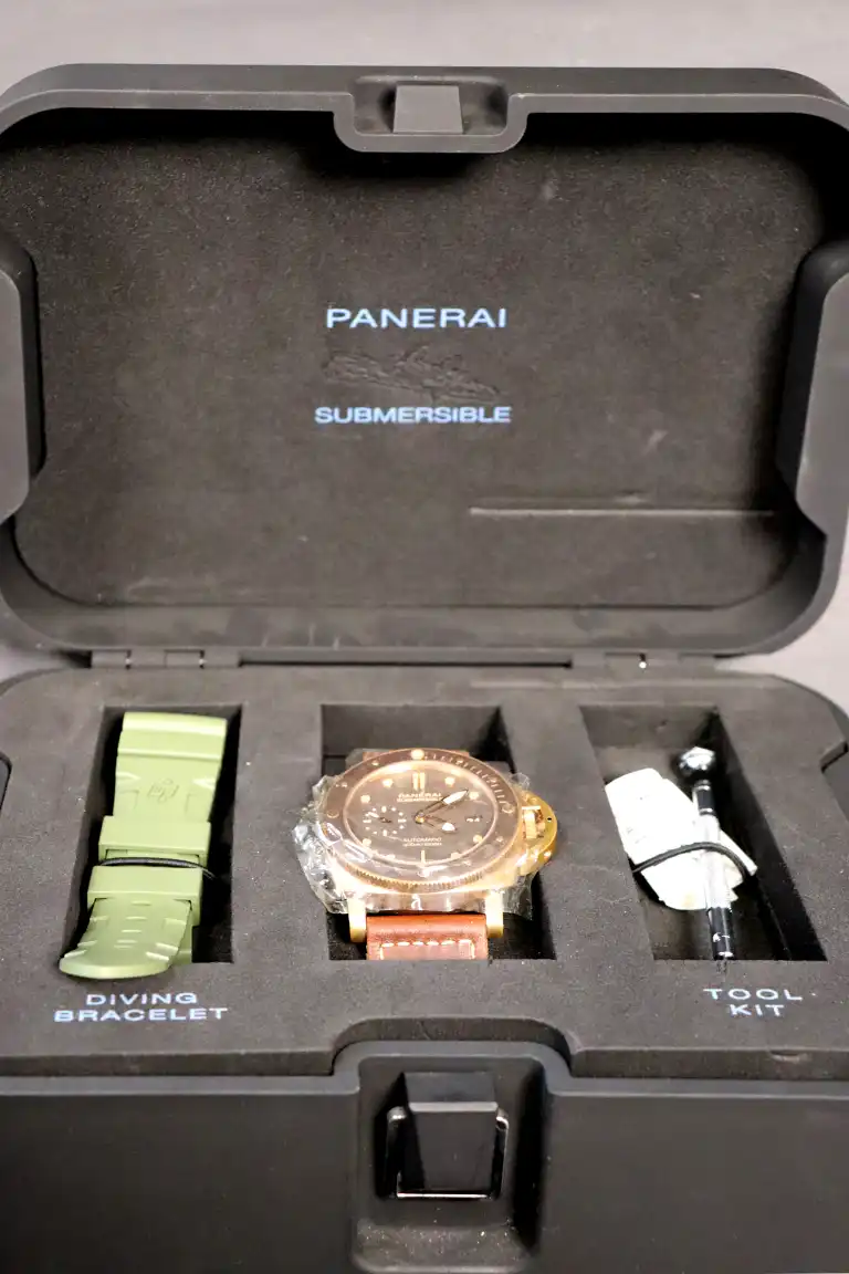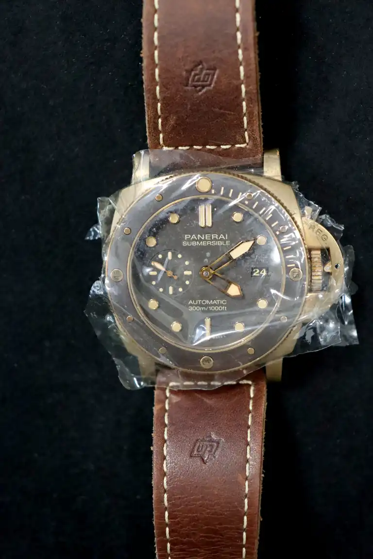 PANERAI. Modèle Submersible Bronzo 47. Montre bracelet homme de plongée. Boitier en acier inoxydable couleur cuivré. Cadran signé à fond brun, compteur des secondes à 9h et guichet dateur à 3h. Mécanisme automatique. Bracelet en cuir brun surpiqué d'origine, avec boucle ardillon en acier cuivré signée. Référence du modèle : PAM 00968. Diamètre boîtier : 47 mm. Largeur bracelet : 21 mm.